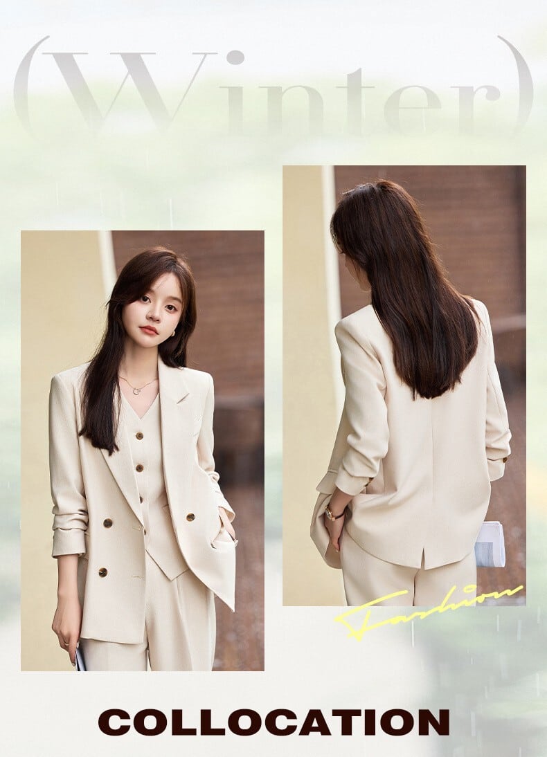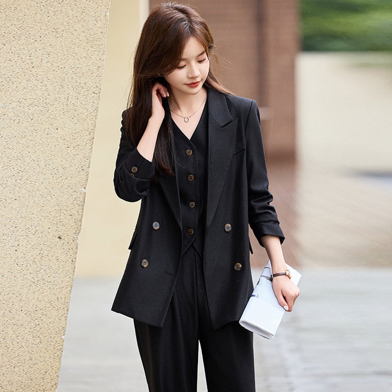 大人エレガントなジャケット+ジレ+パンツのセットアップスーツ。