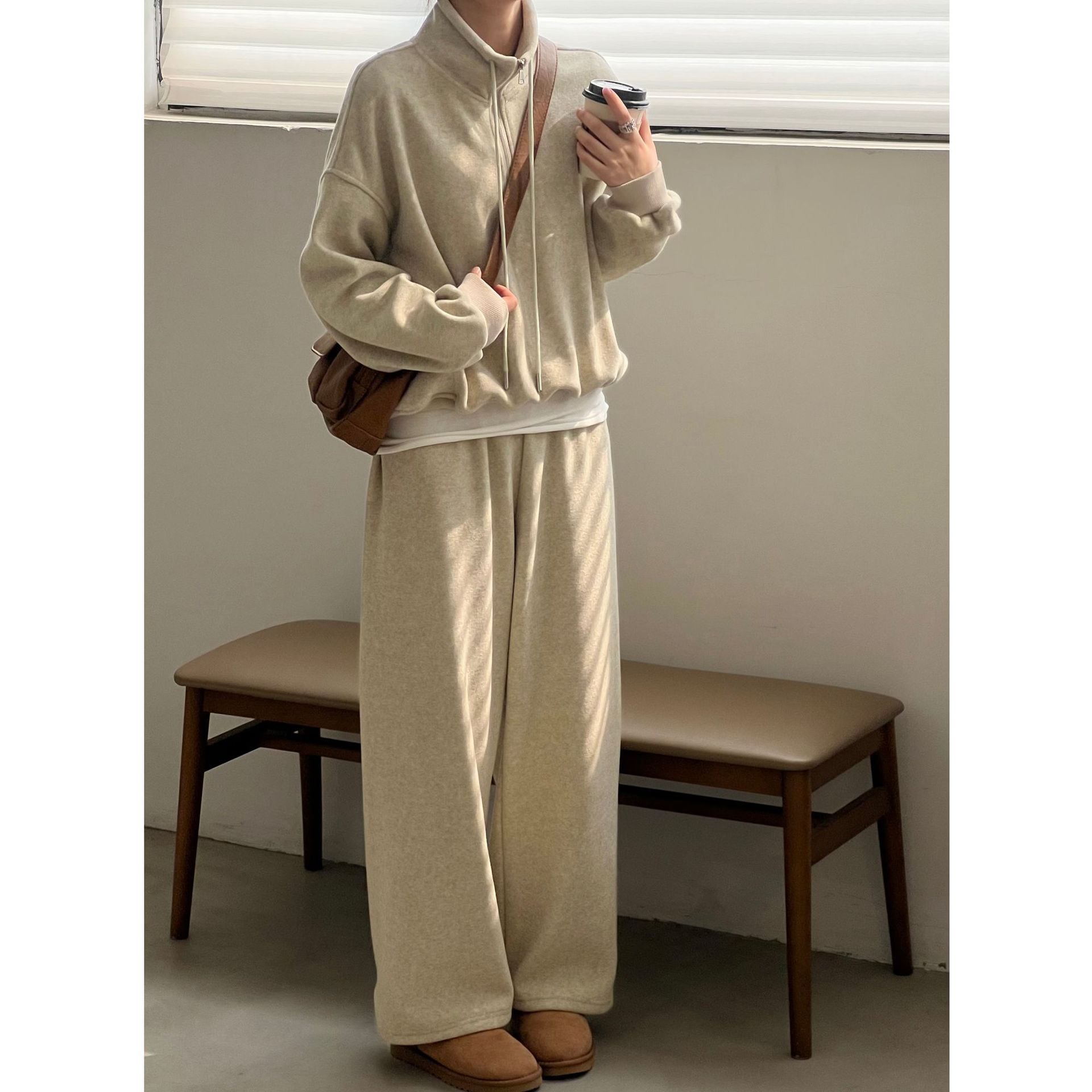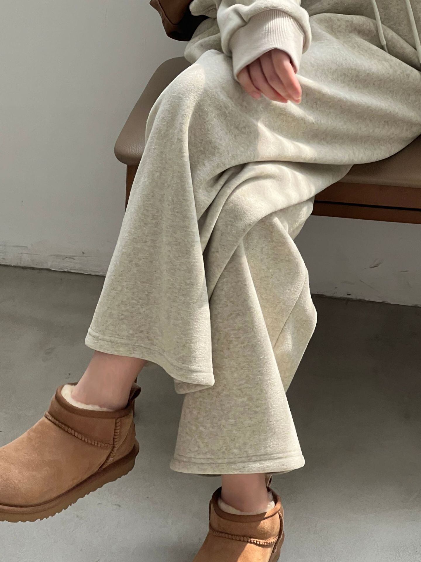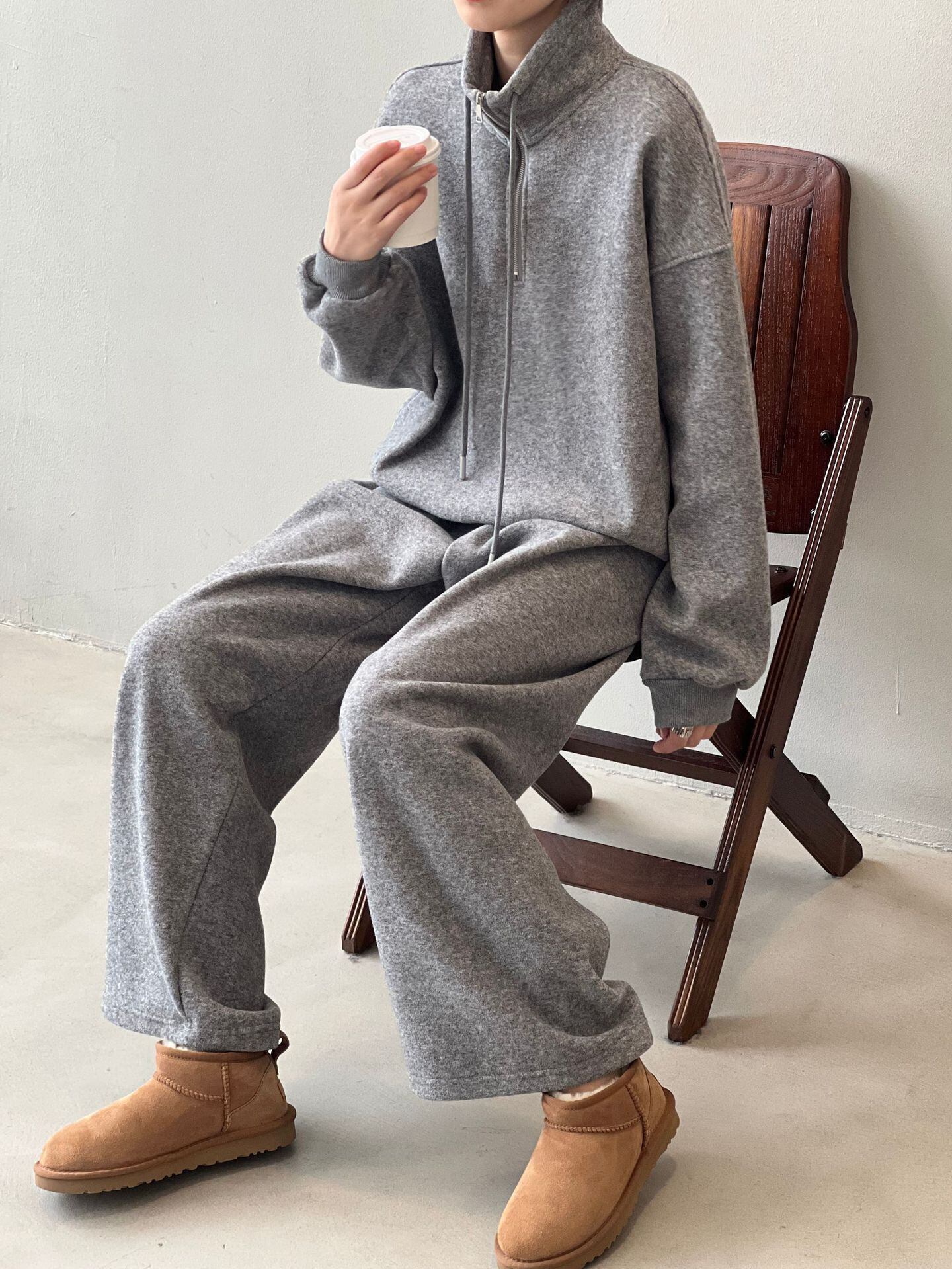 大人カジュアルなニットパーカー+ワイドパンツのセットアップ。