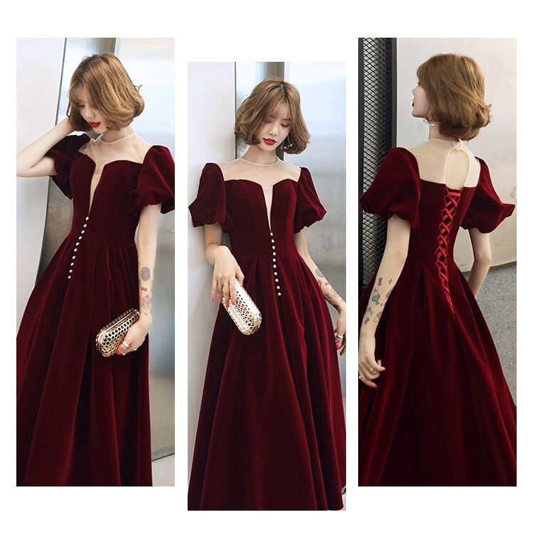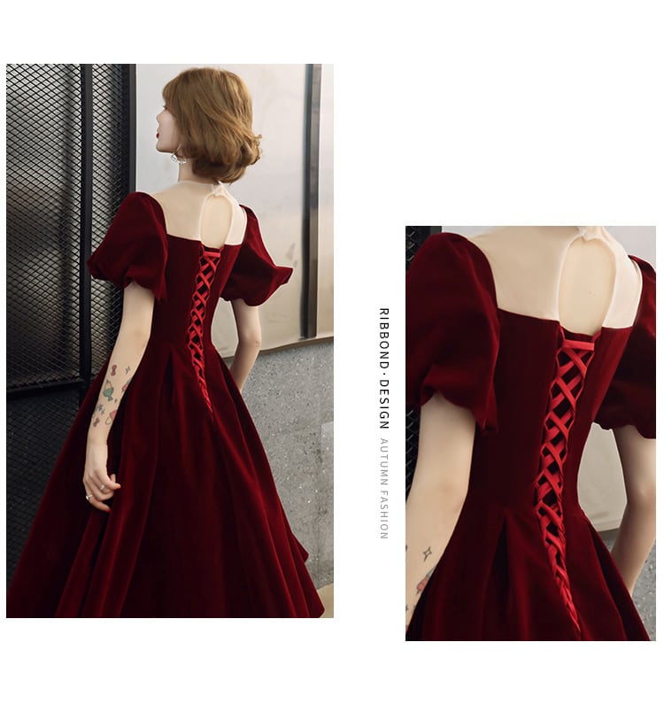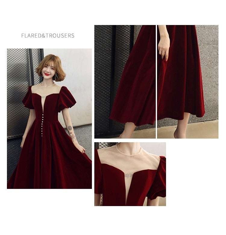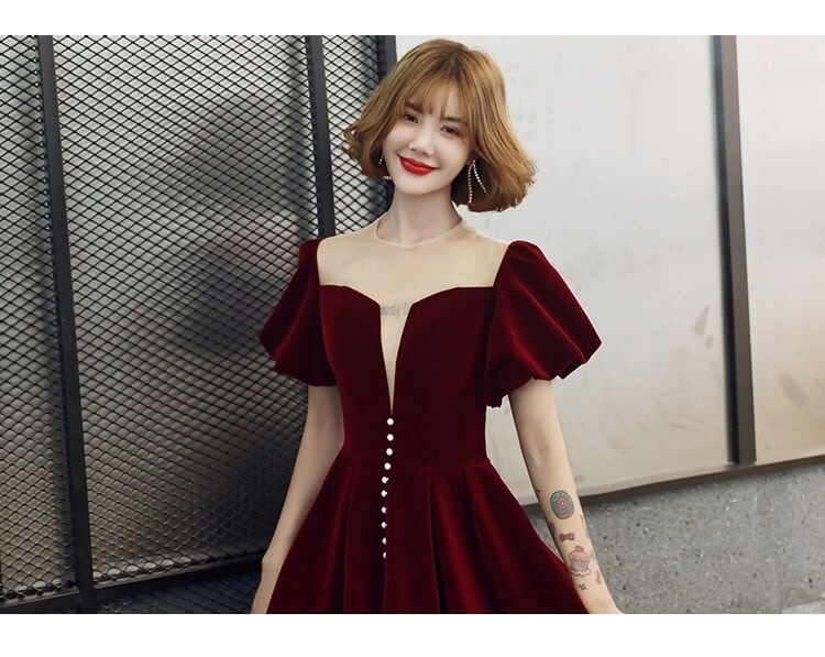 深紅のレッドカラーがドレッシーなベルベット素材のパーティードレス。