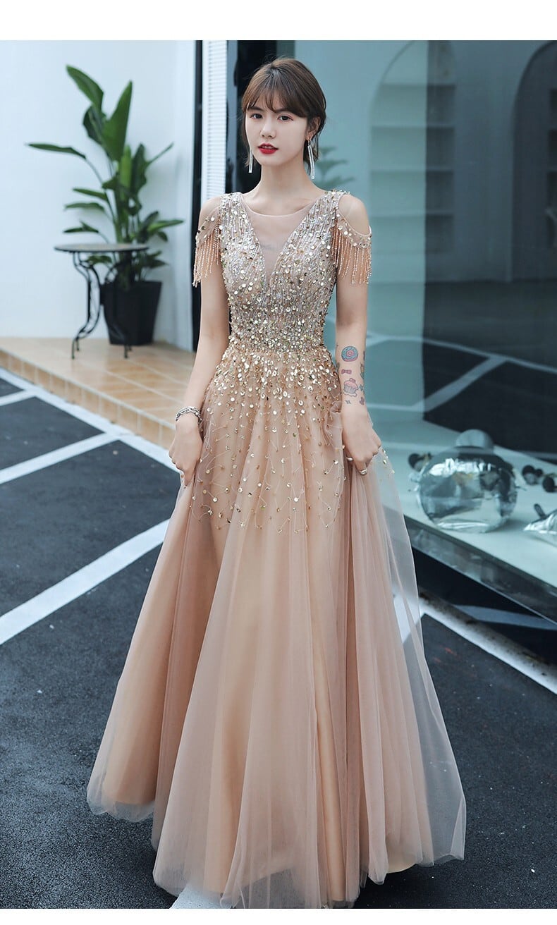 大人エレガントなシャンパンカラーのオフショルパーティードレス。