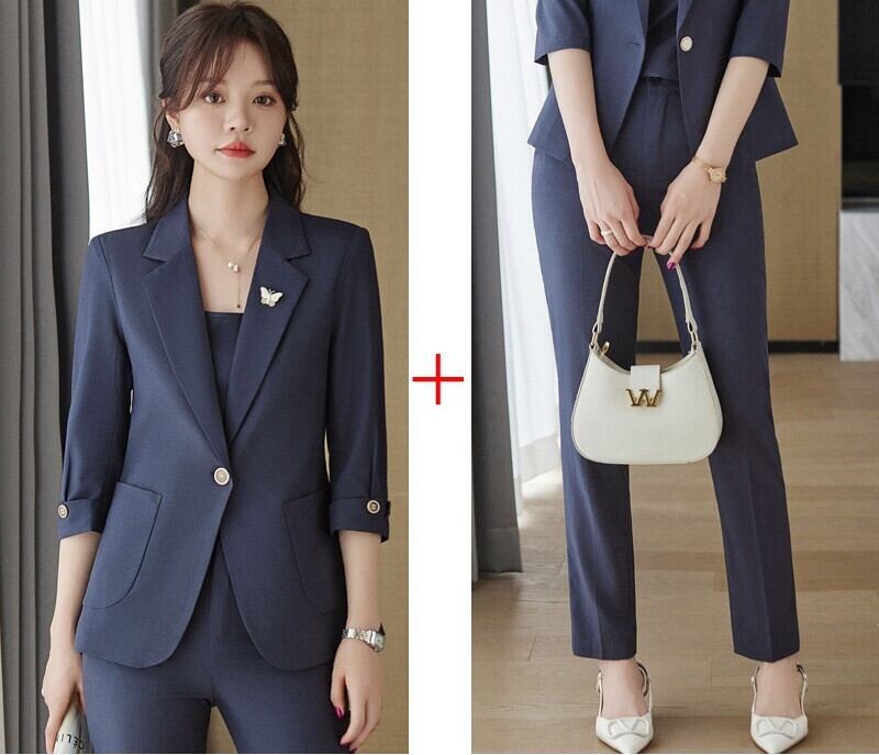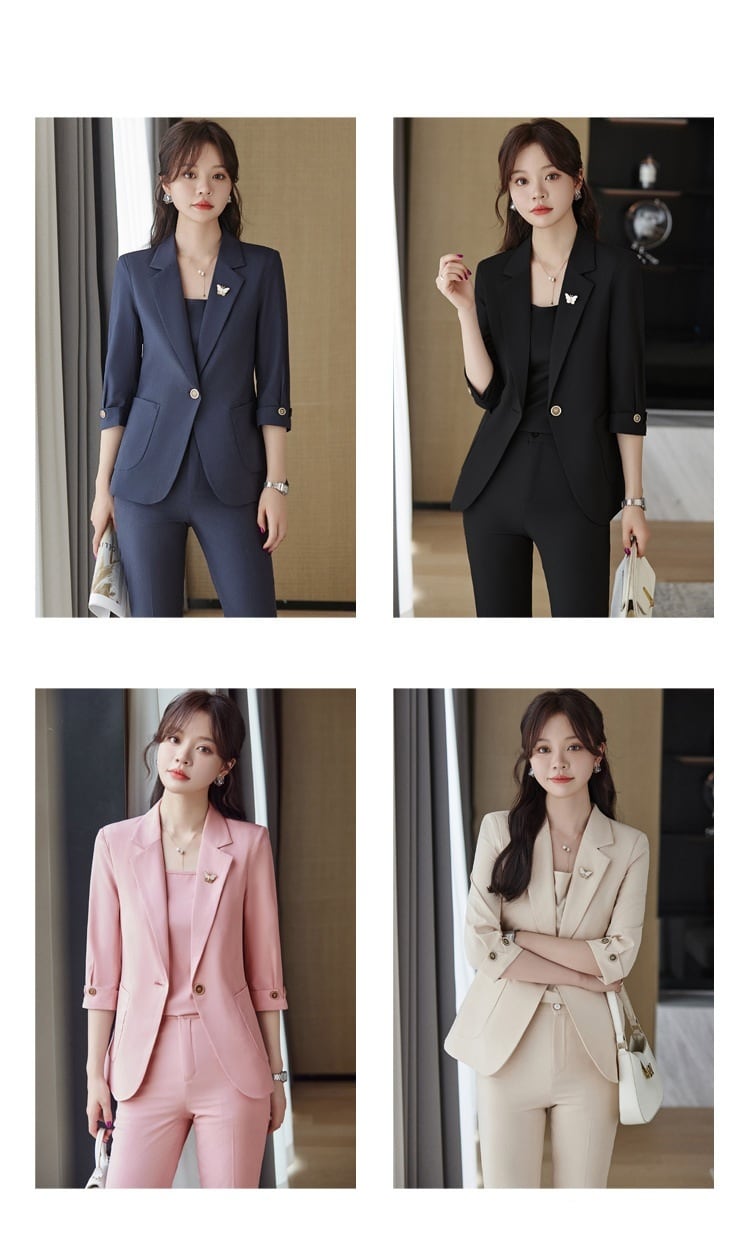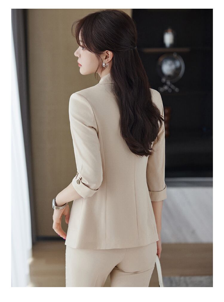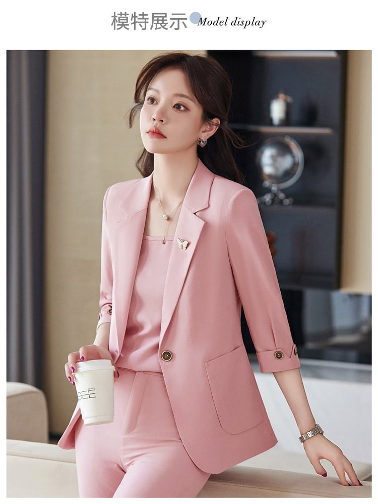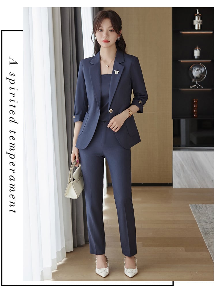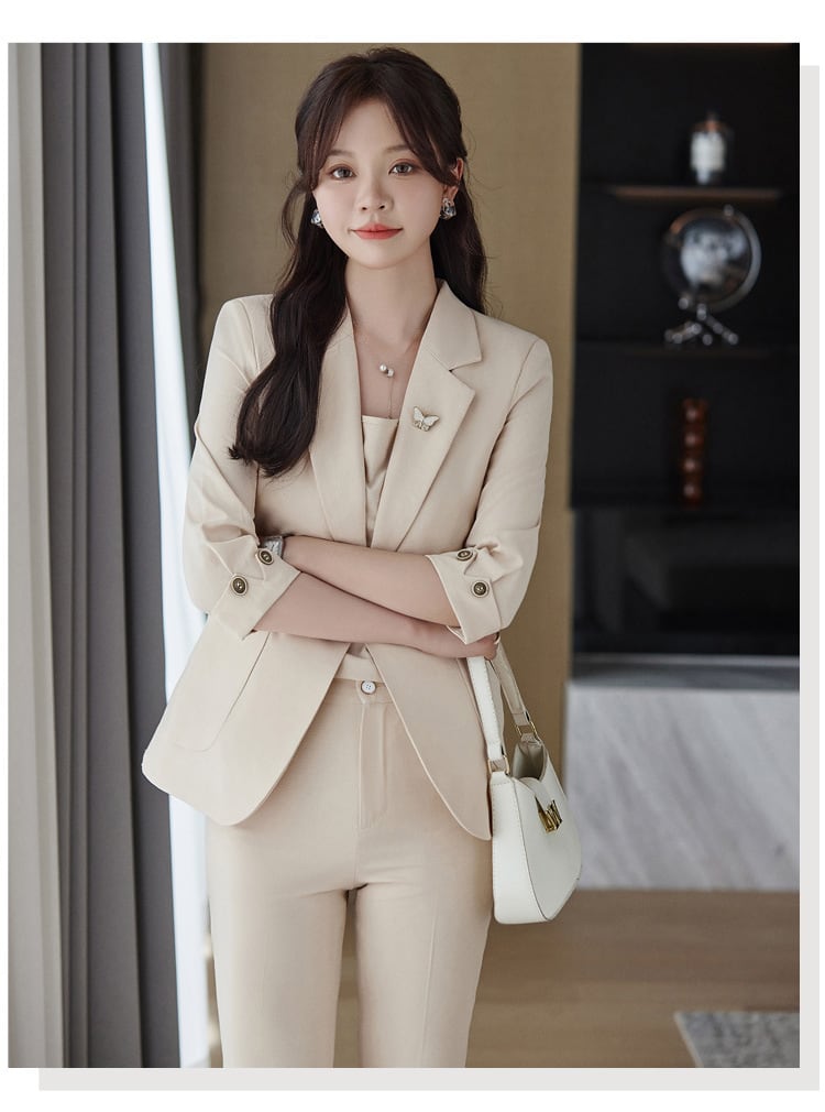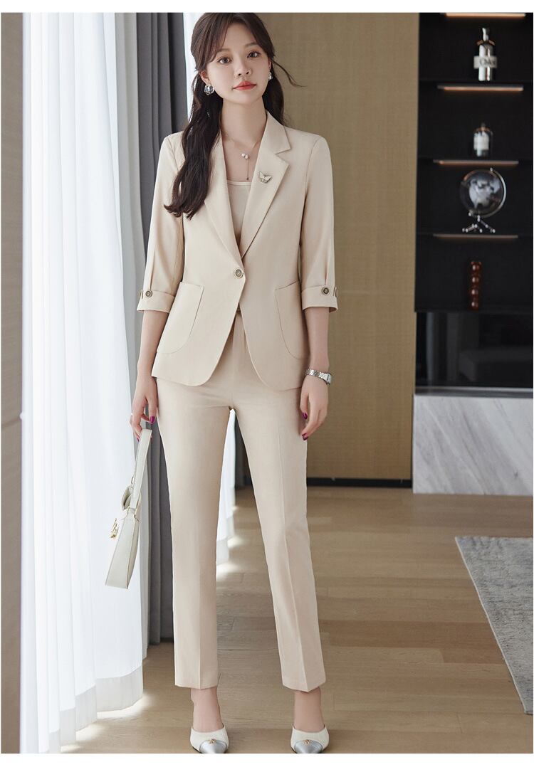 大人エレガントなキャミソール+ジャケット+テーパードパンツのパンツスーツ。