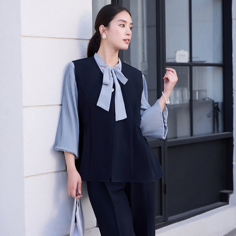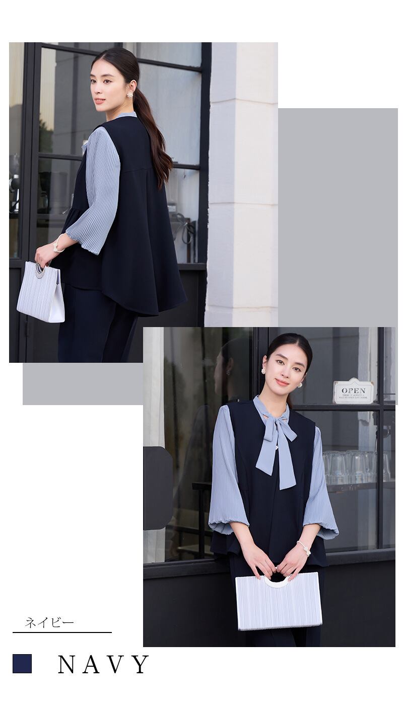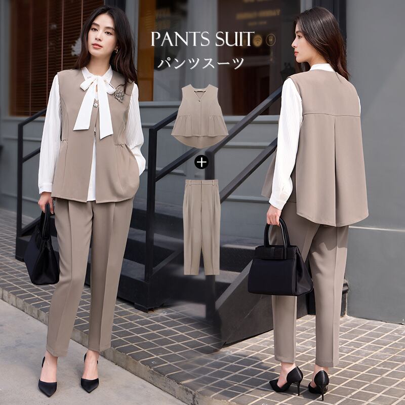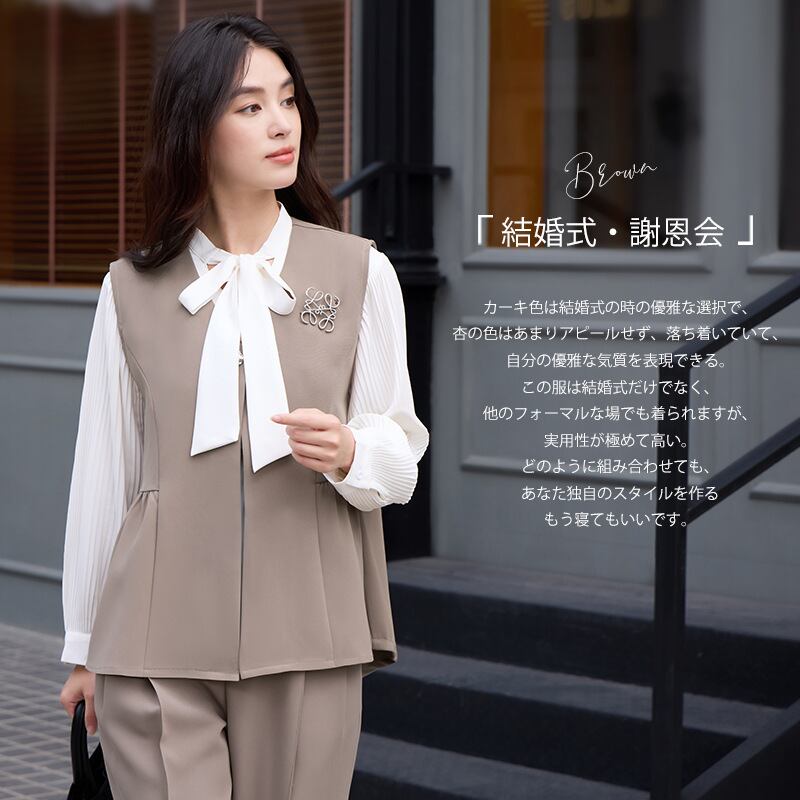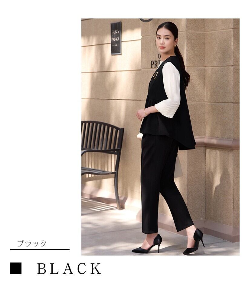 大人エレガントなジレ+パンツのセットアップドレス。