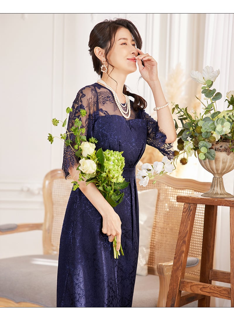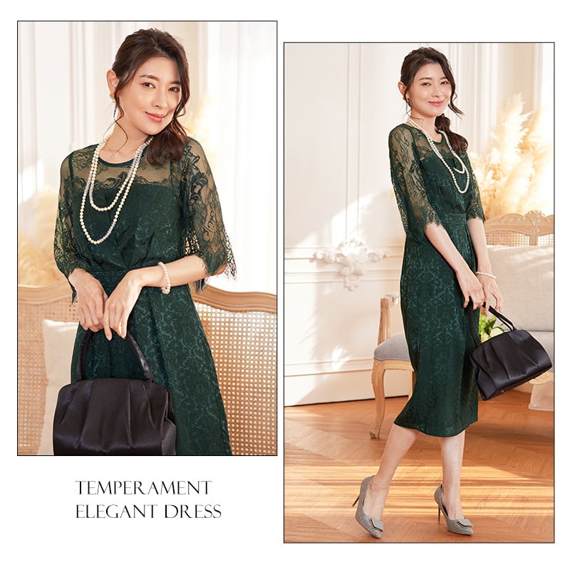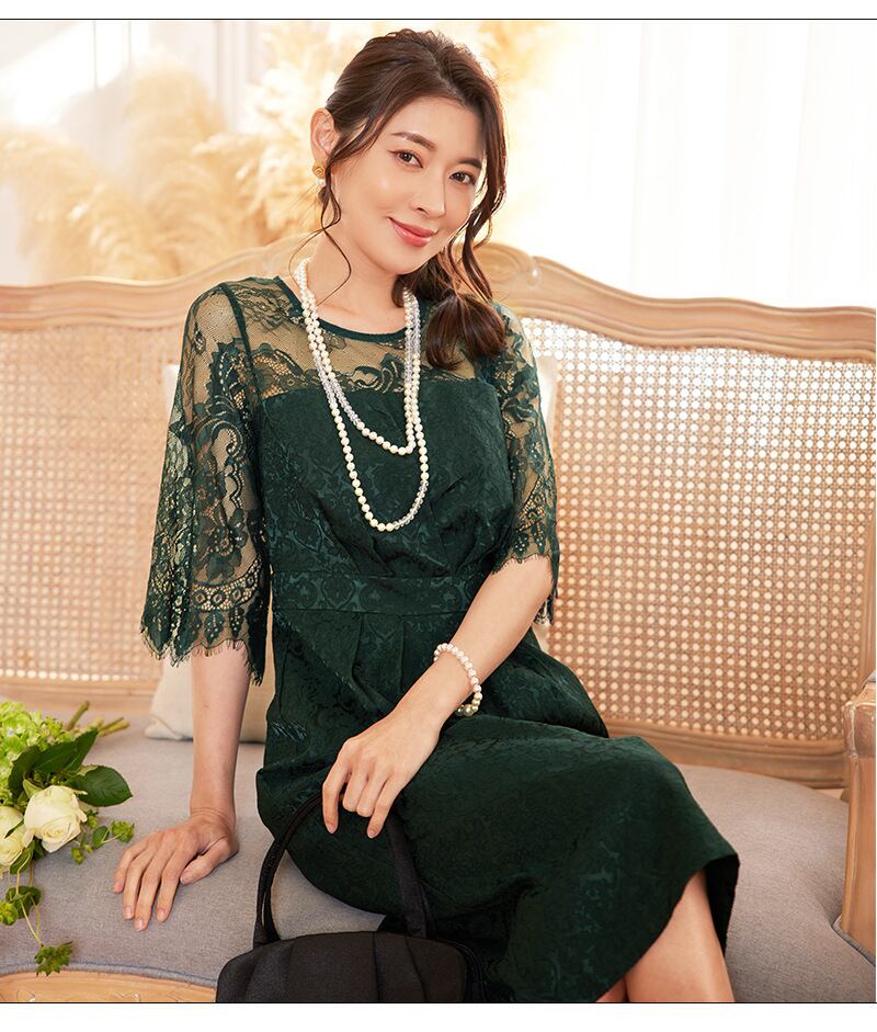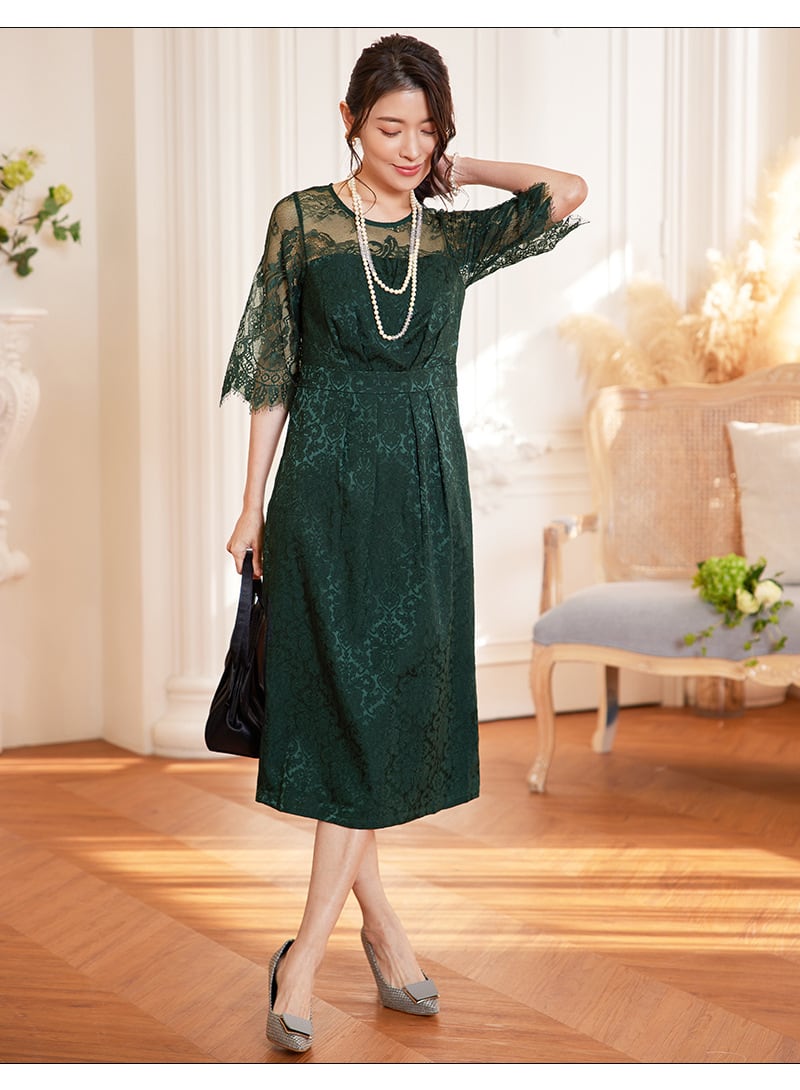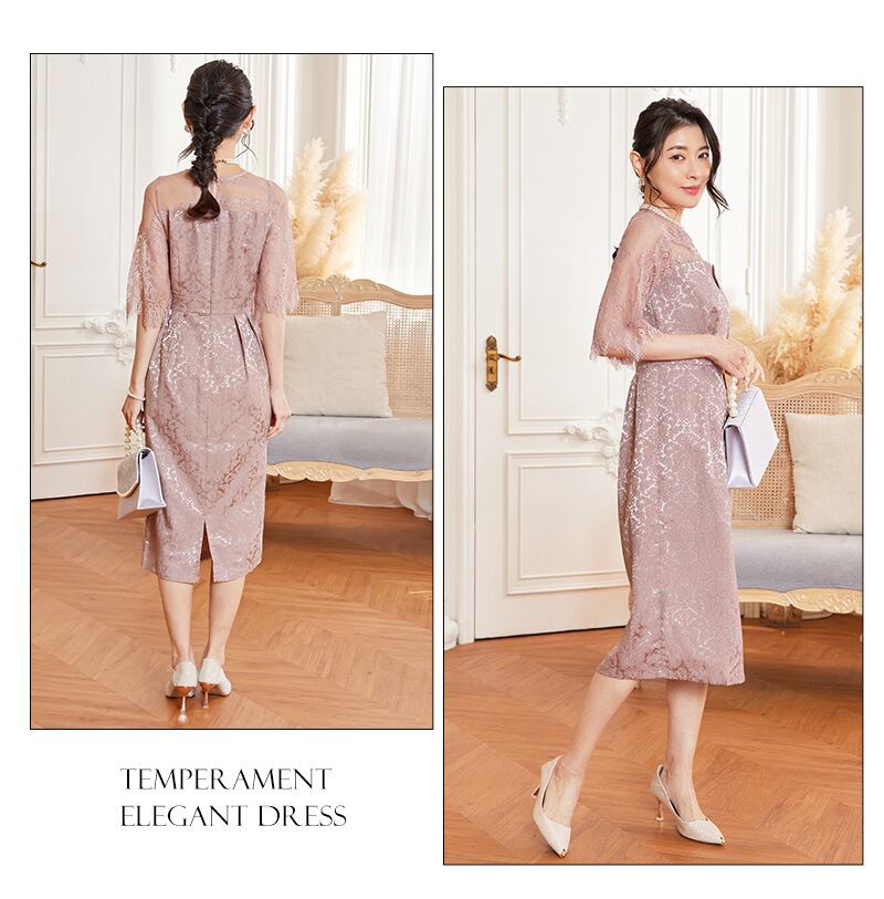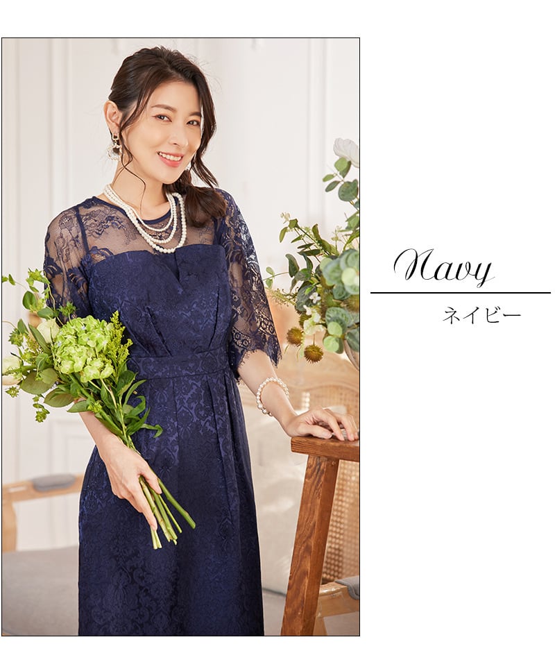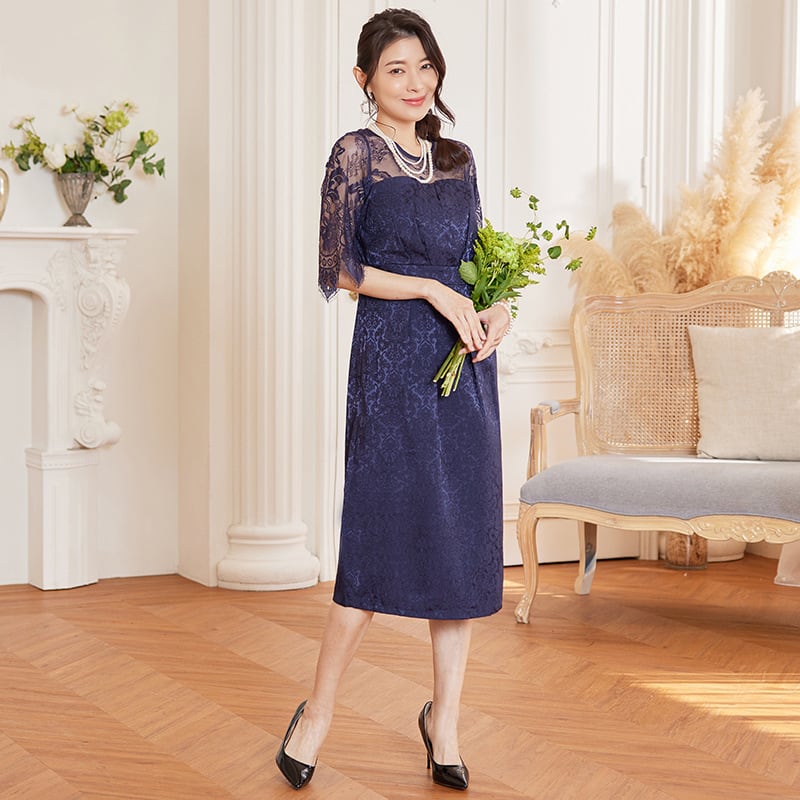 総レースのシアーなお袖とデコルテラインが女性らしさを引き立てる。