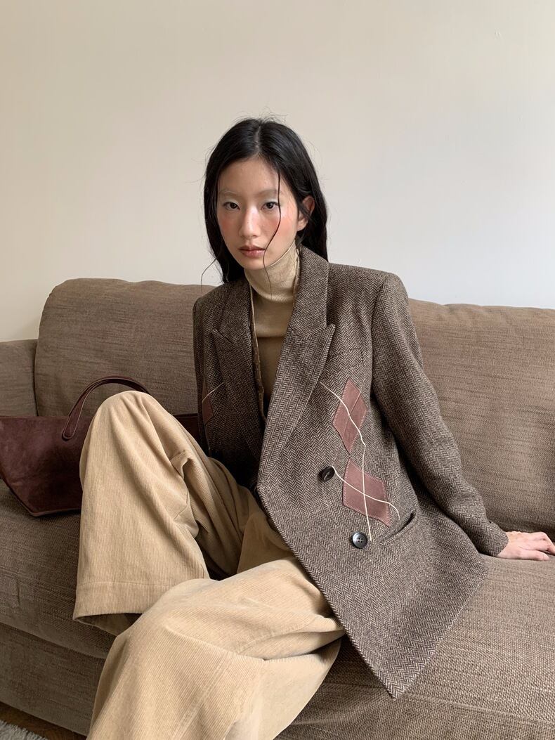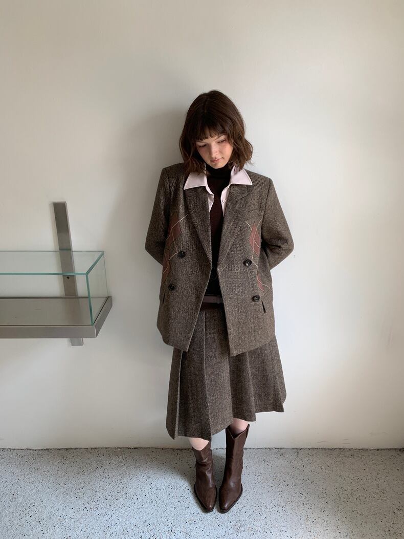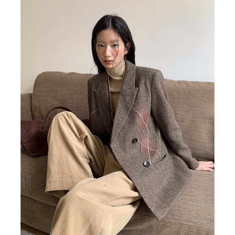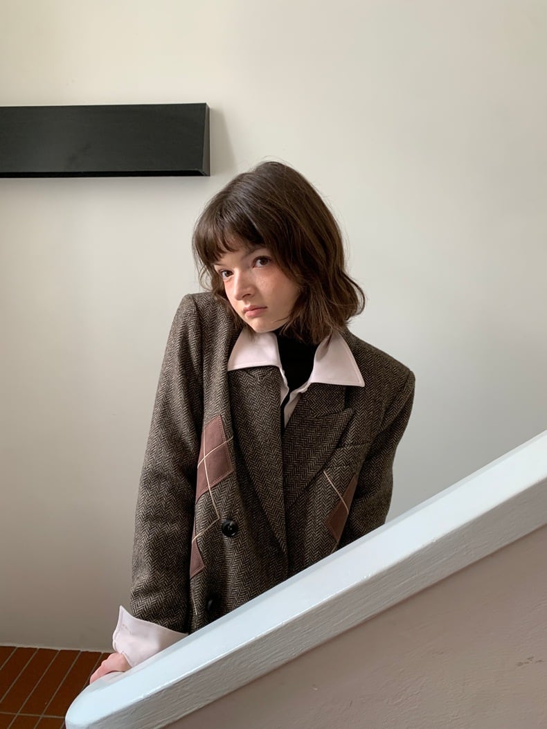 大人可愛いヘリンボーンのダイヤ柄テーラードジャケット。