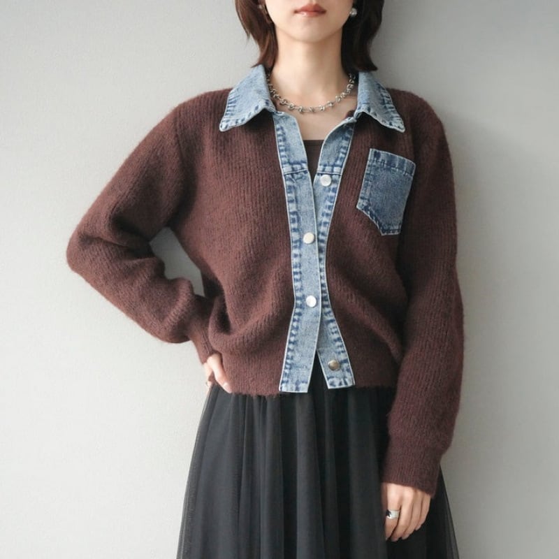 【セットアップ】 セットアップ レディース おしゃれ ママ チュール スカート デニム ドッキング カーディガン 春 秋 冬 20代 30代 40代 きれいめ ブラウン×ブラック 黒 ネイビー×ホワイト 白 ベージュ×ブラウン 茶色 グレー