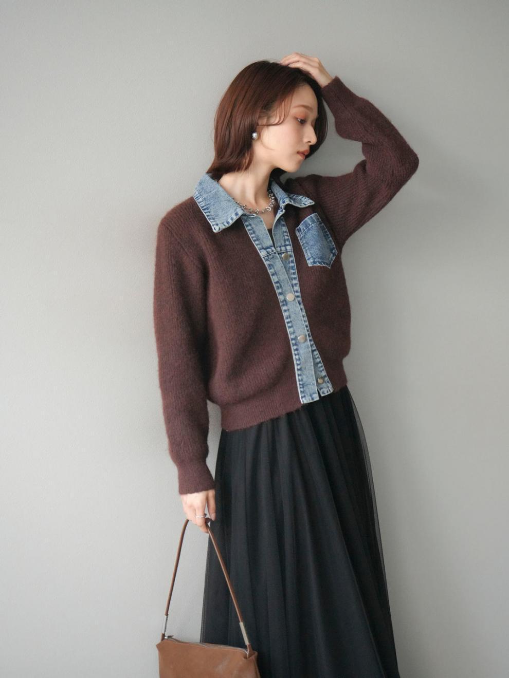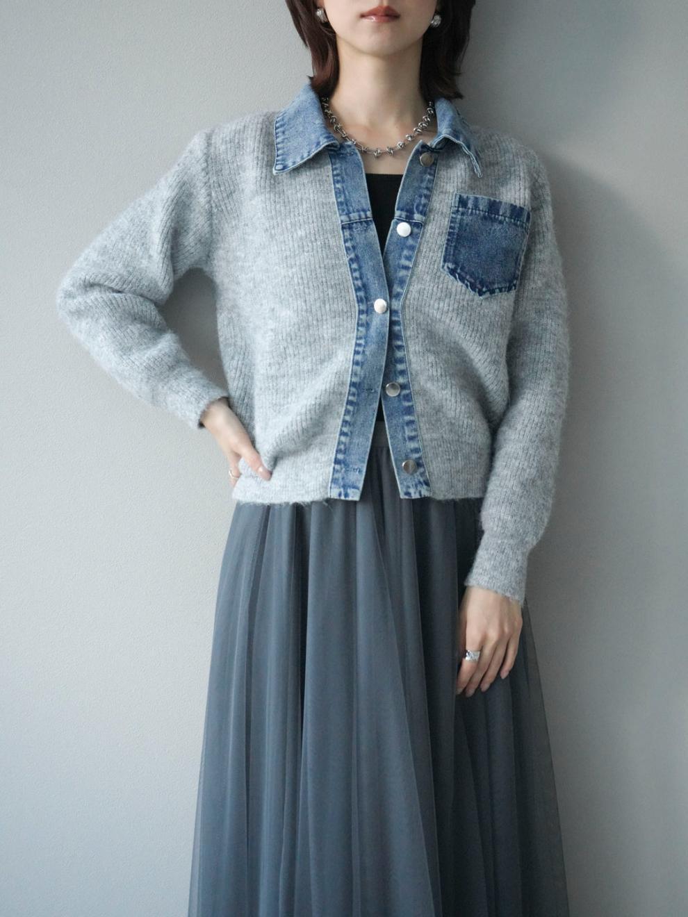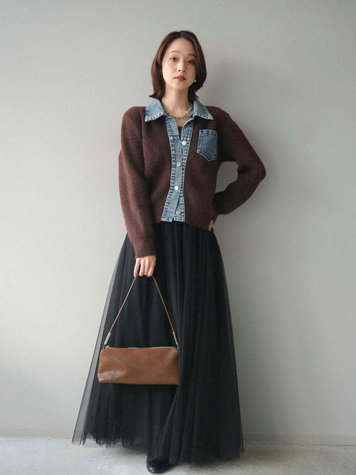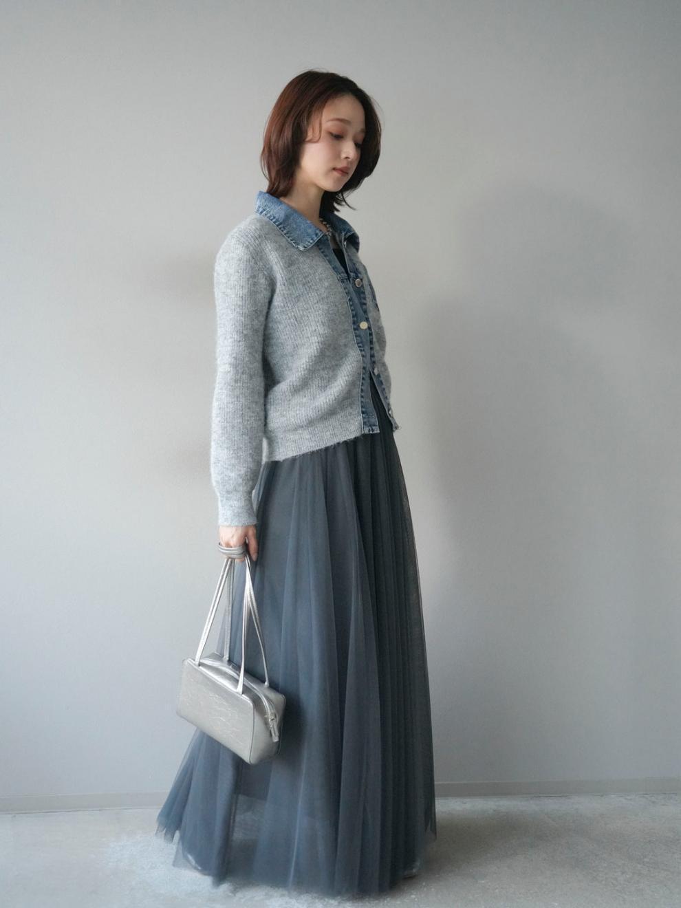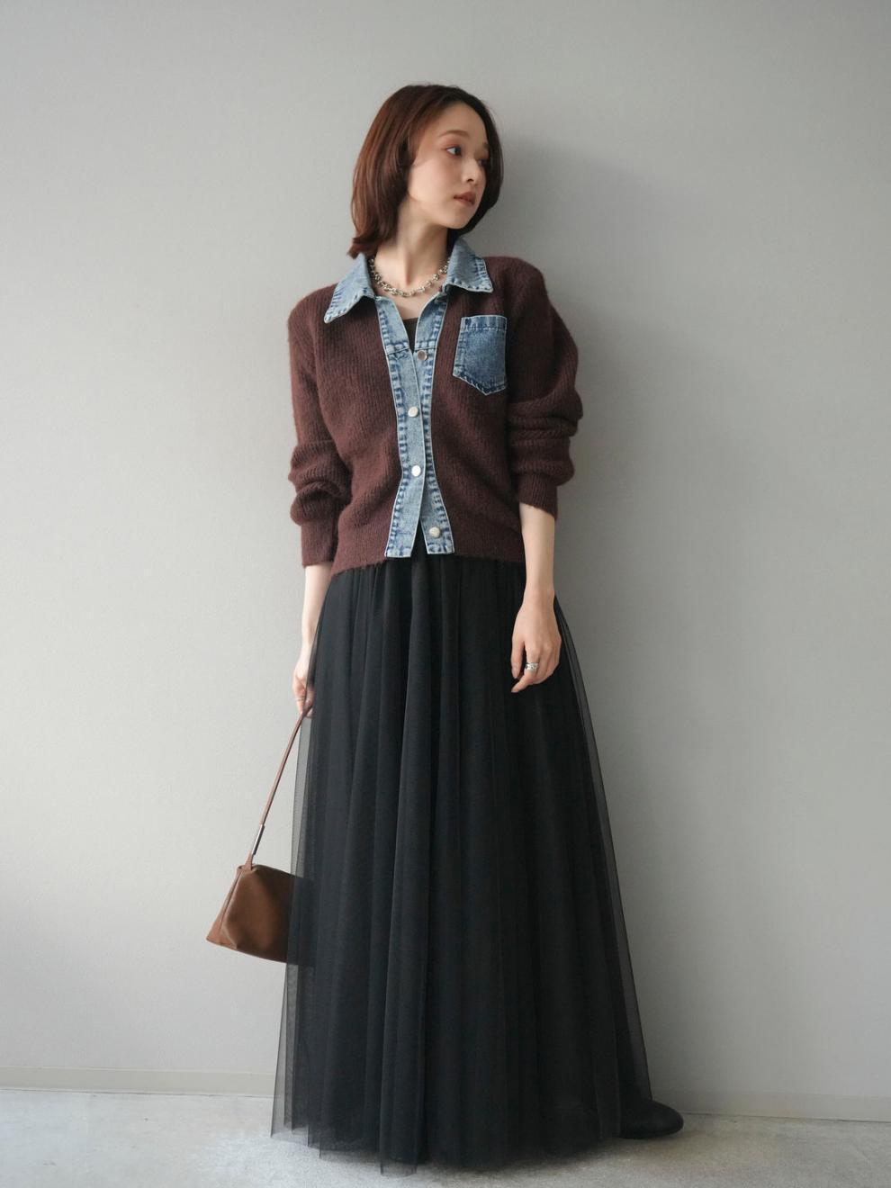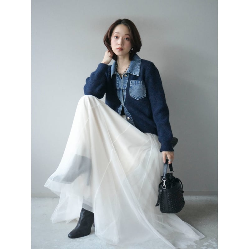 大人エレガントなデニムドッキングカーディガン+チュールスカートのセットアップ。