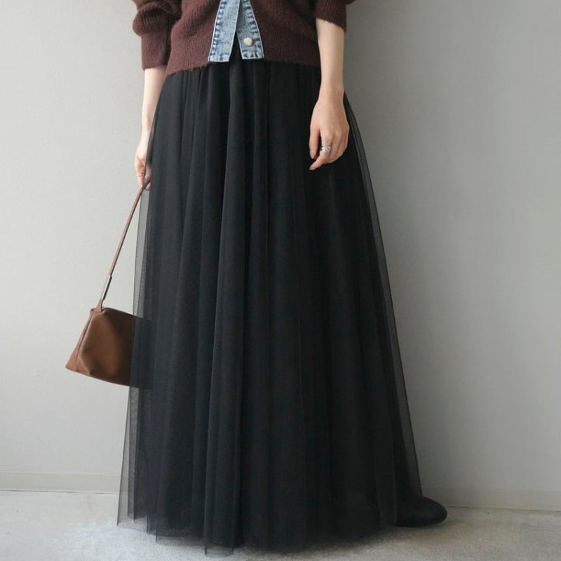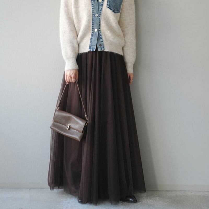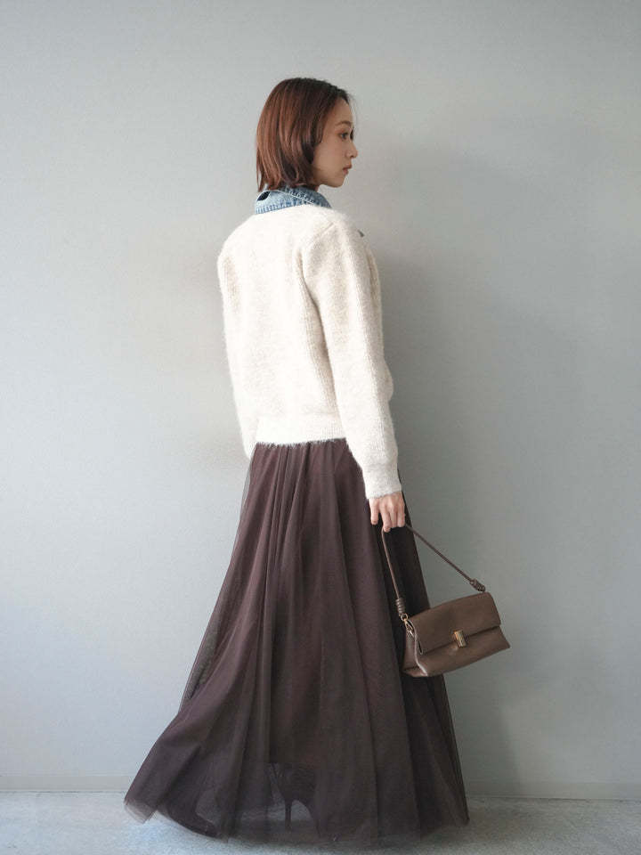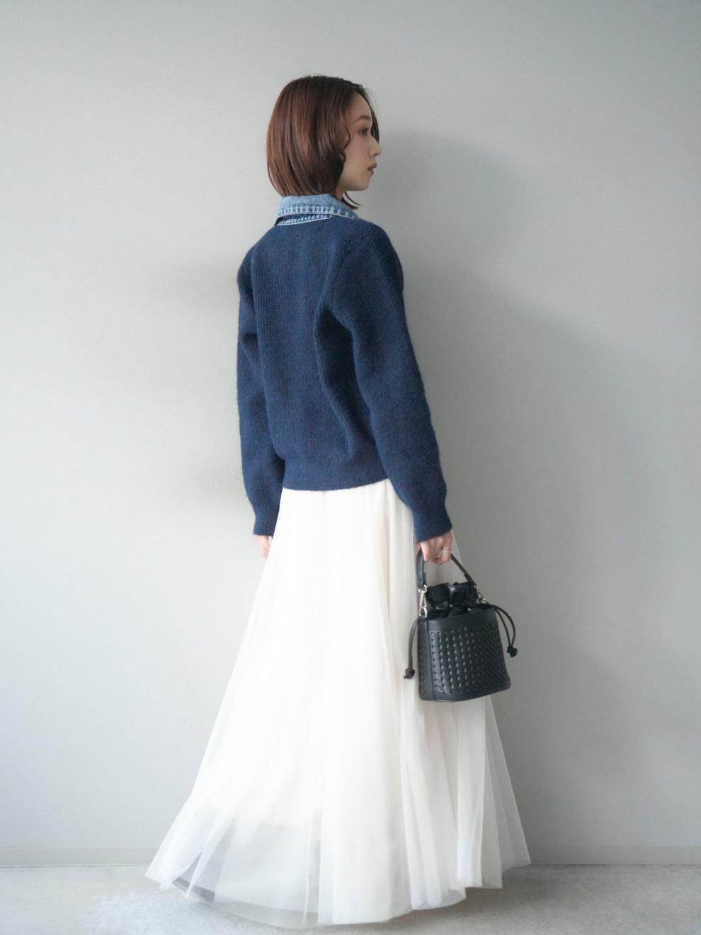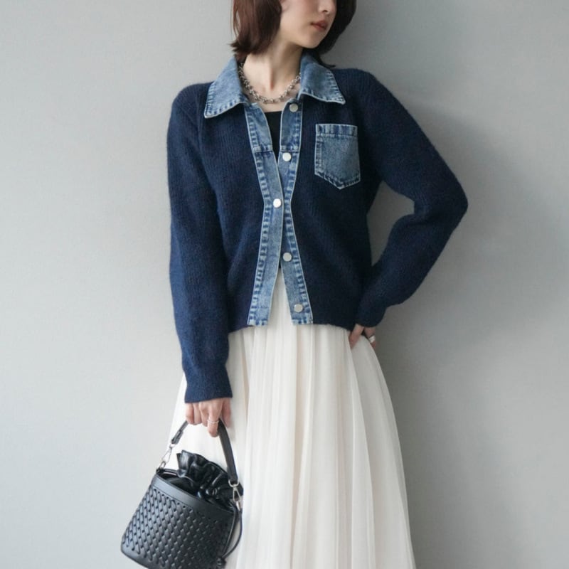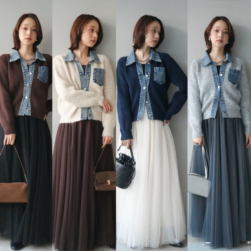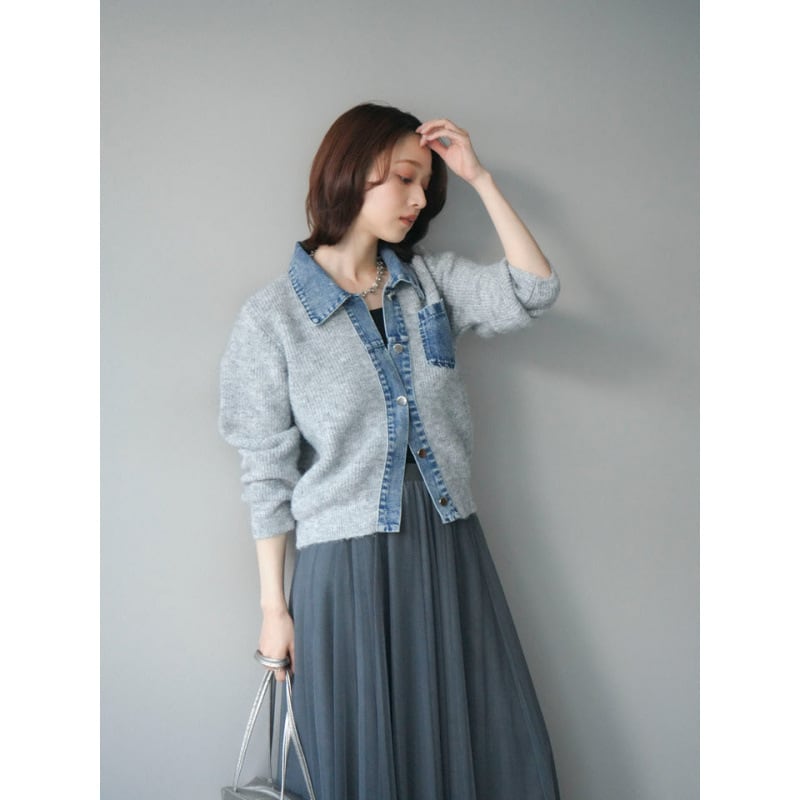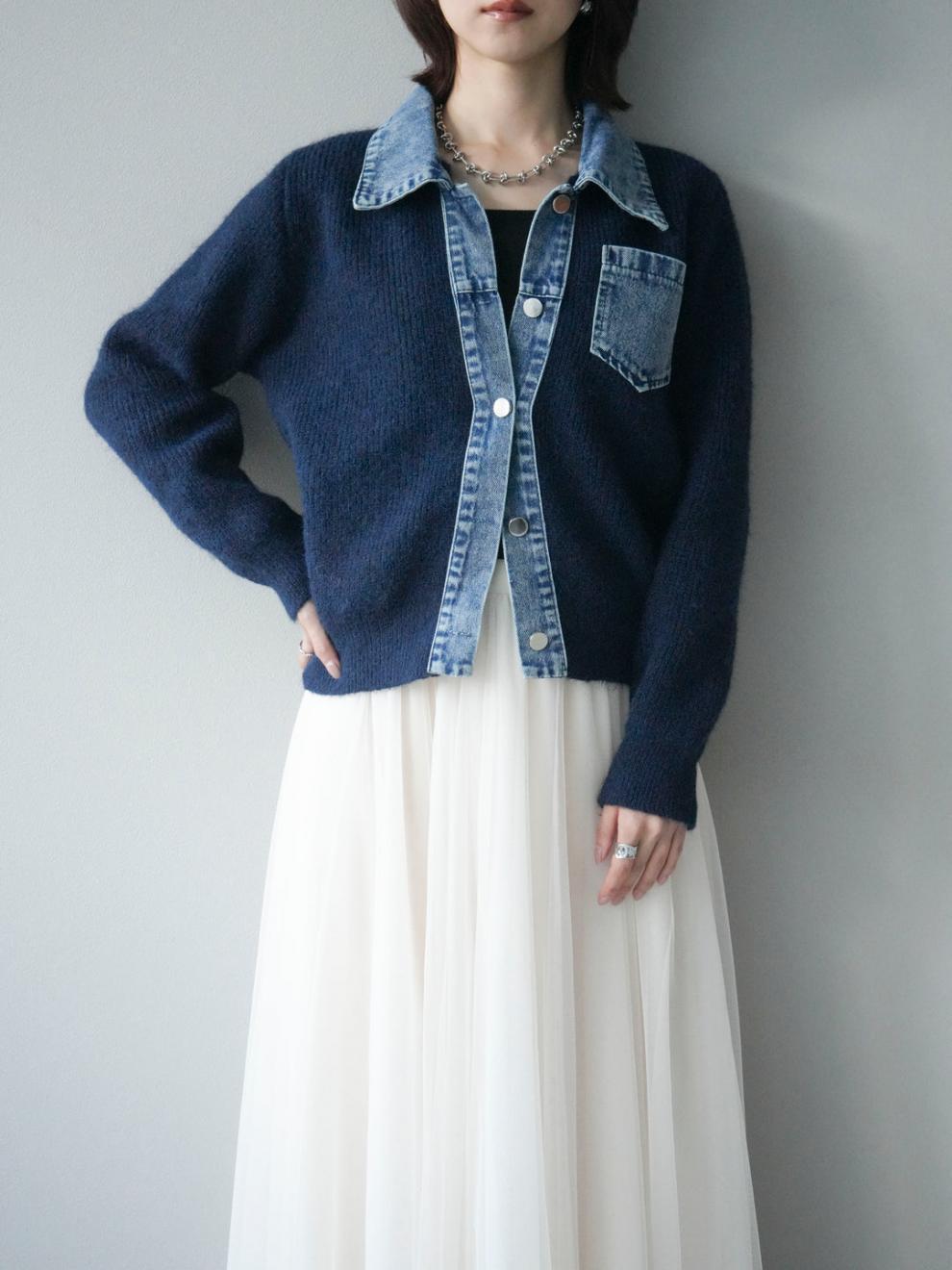 大人エレガントなデニムドッキングカーディガン+チュールスカートのセットアップ。