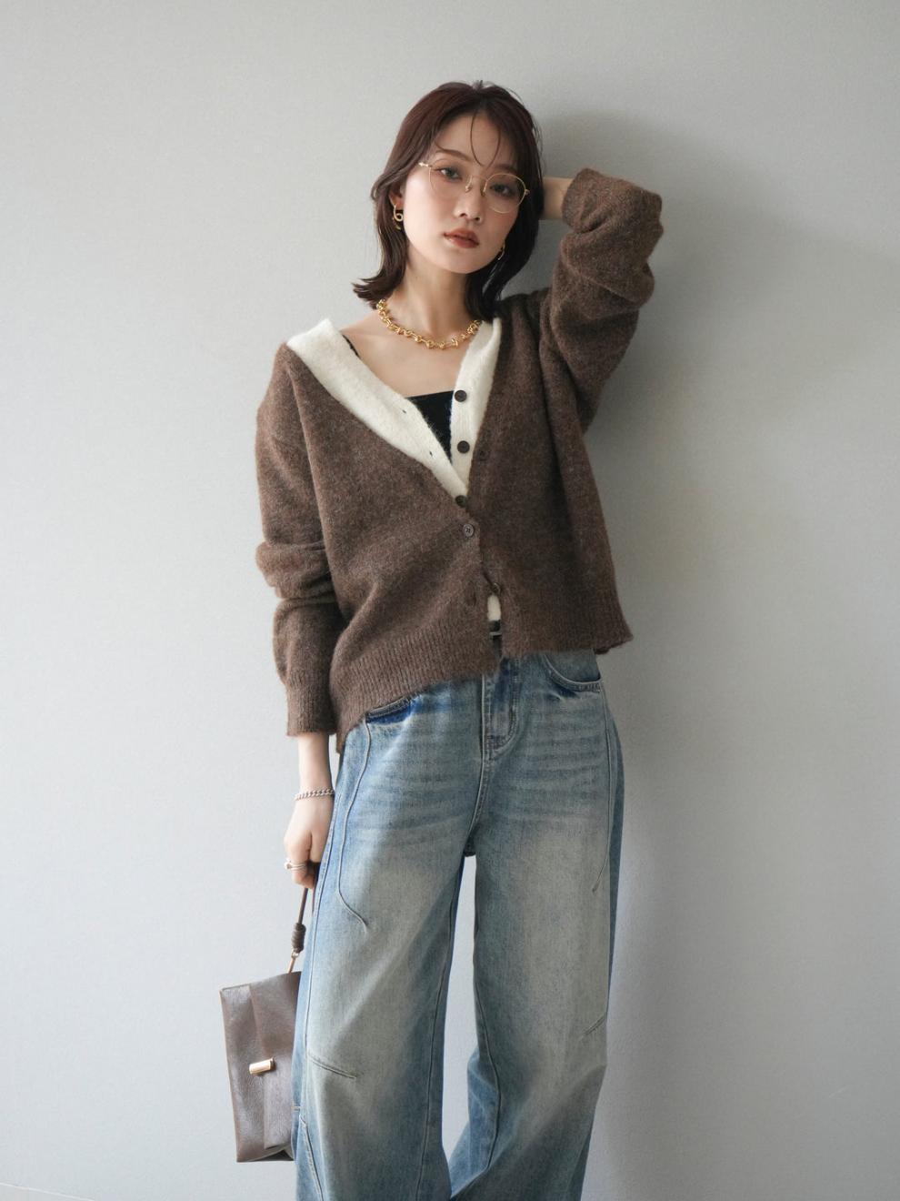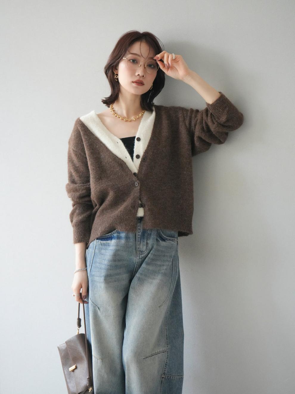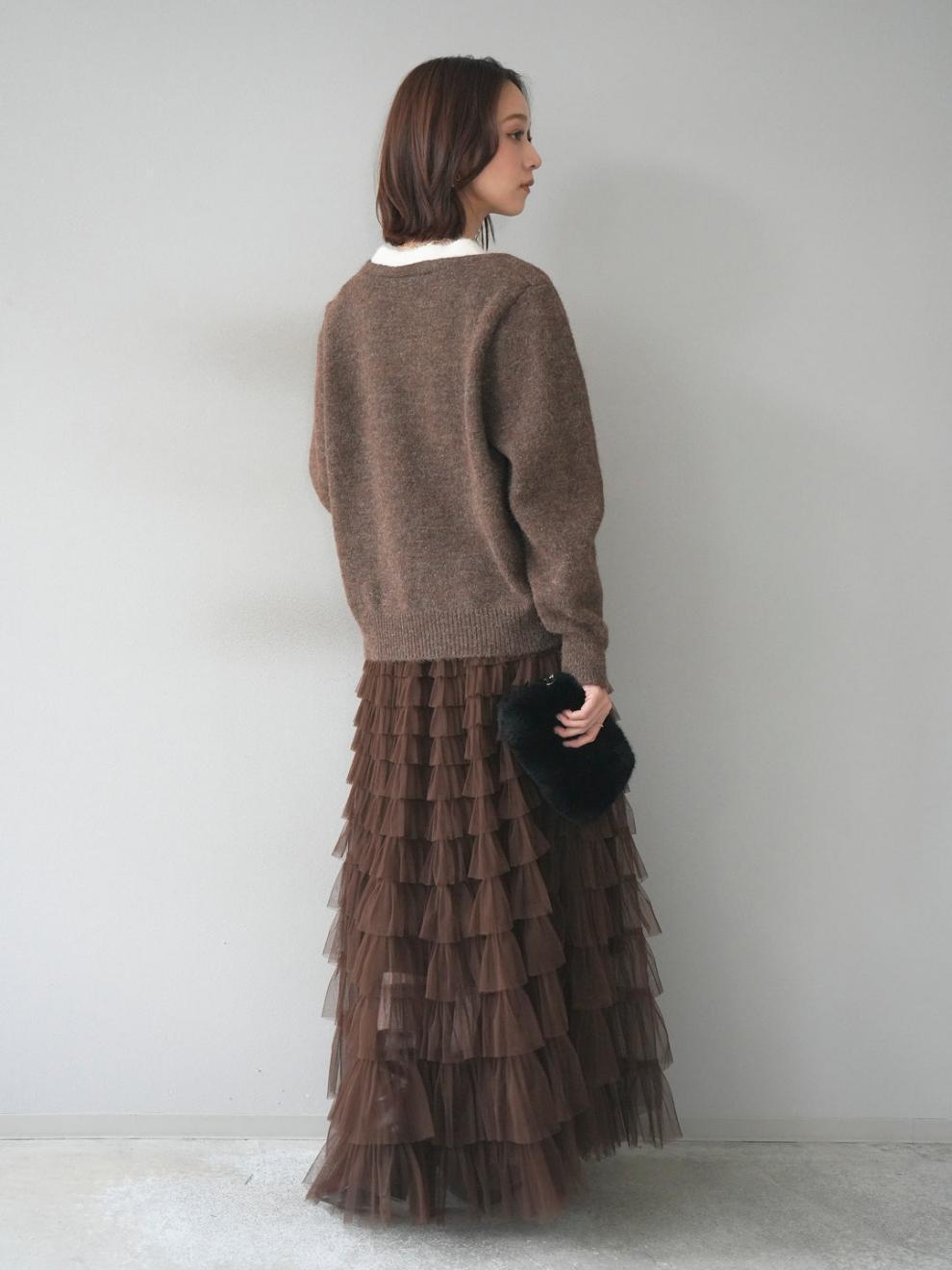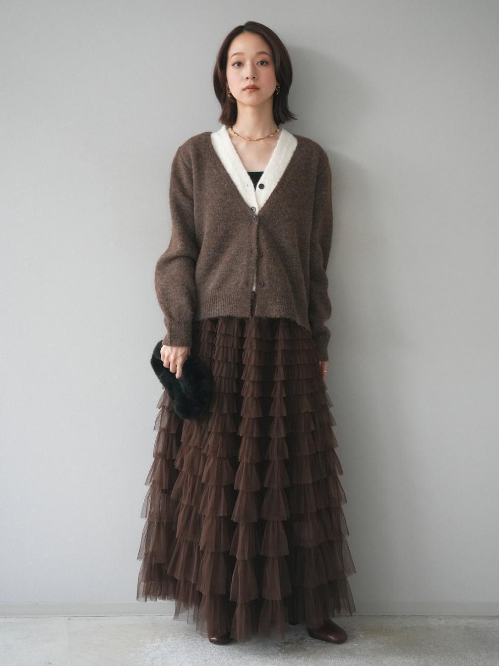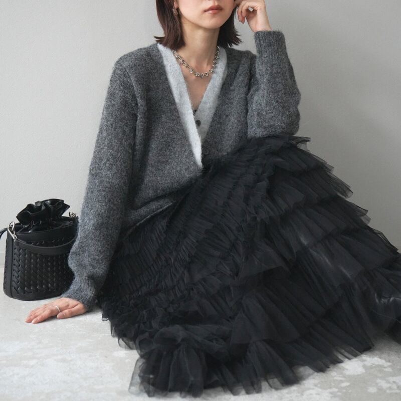 大人エレガントな配色レイヤードニットカーディガン+チュールティアードスカートのセットアップ。