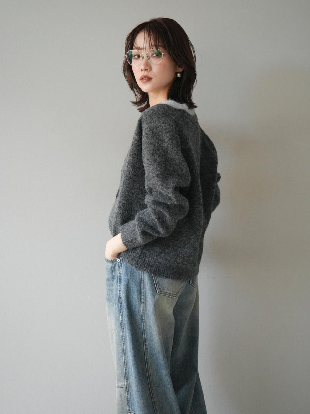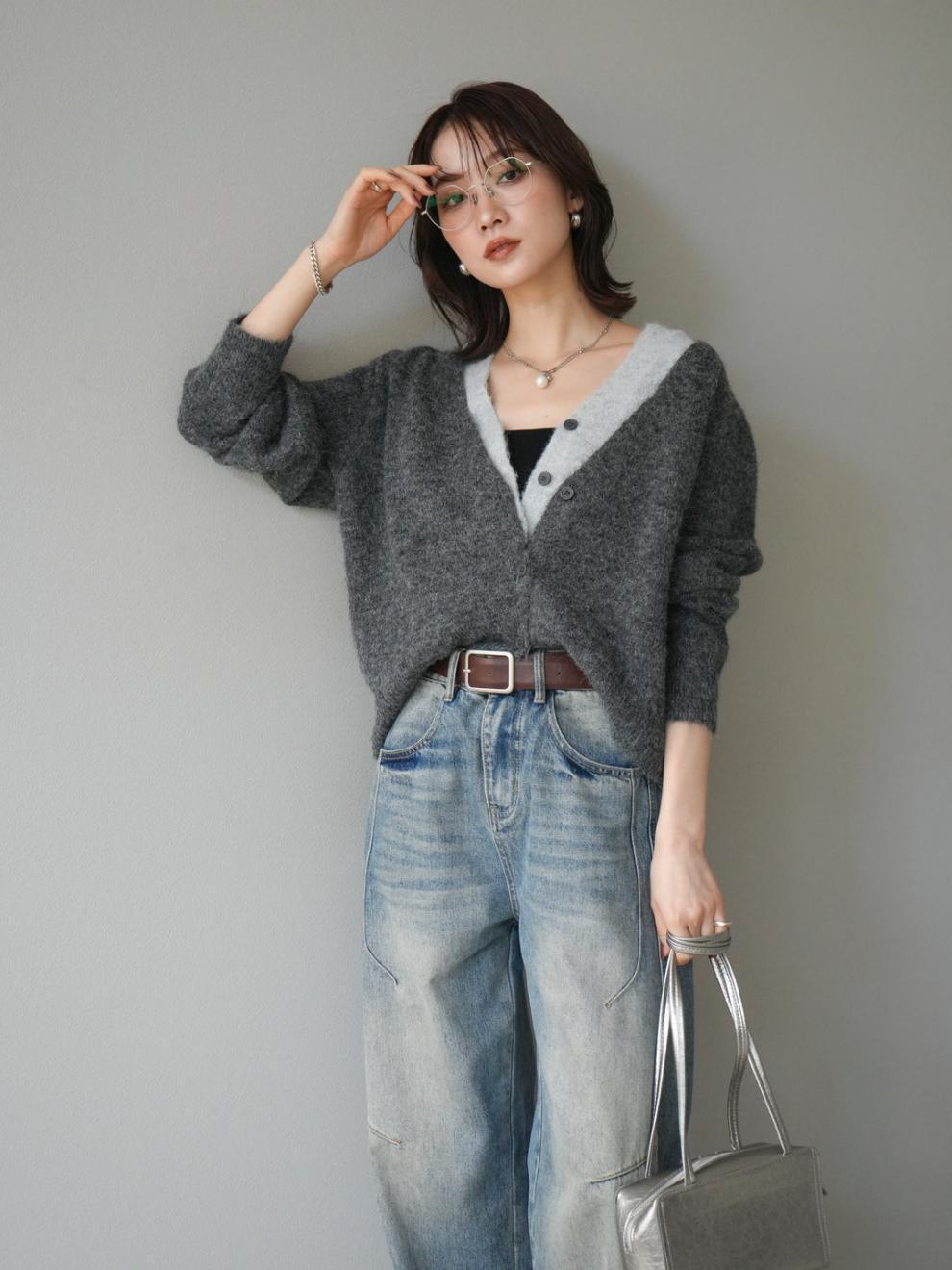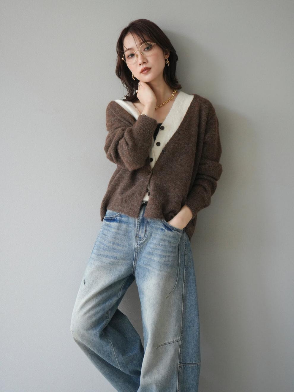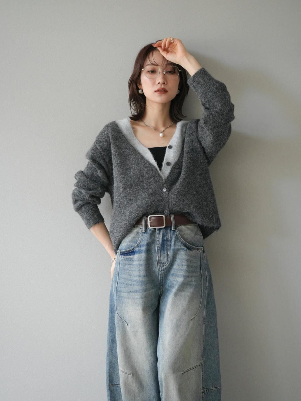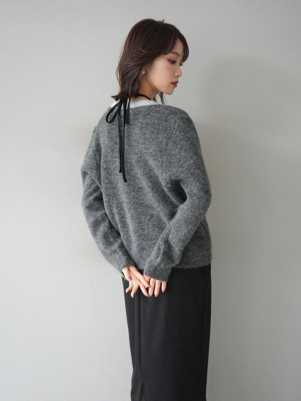 大人エレガントな配色レイヤードニットカーディガン+チュールティアードスカートのセットアップ。