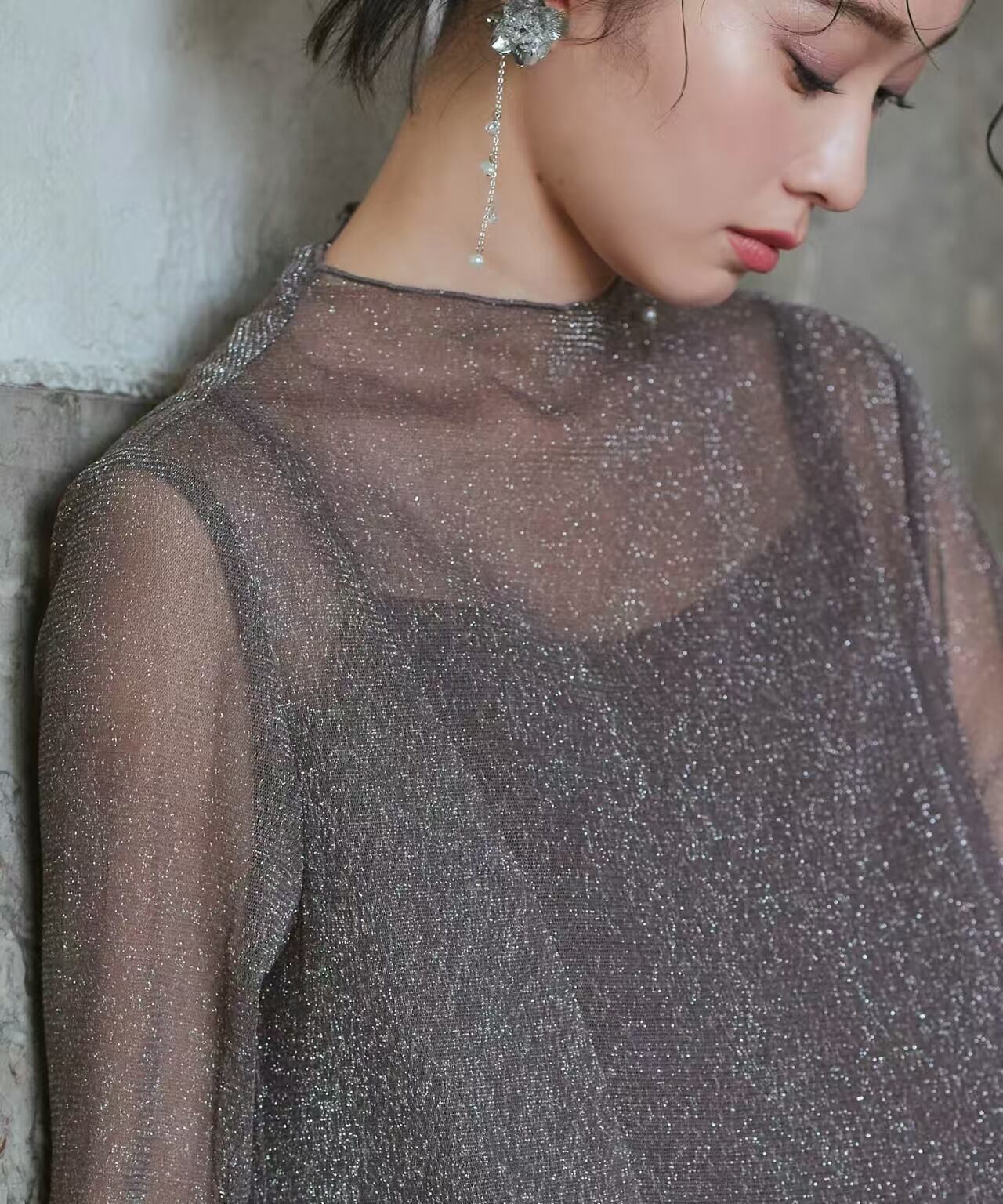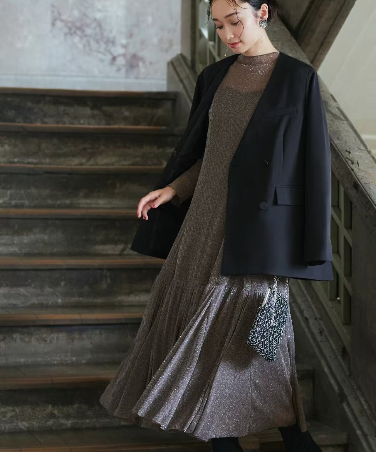 ハイネック&ロングスリーブがクラシカルな印象に。