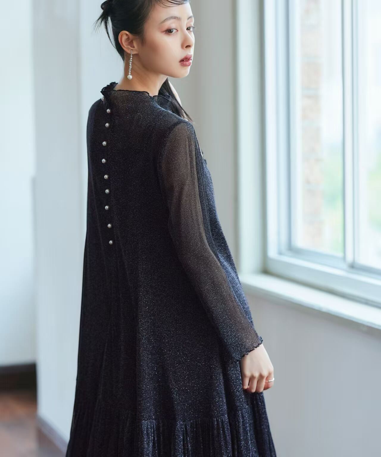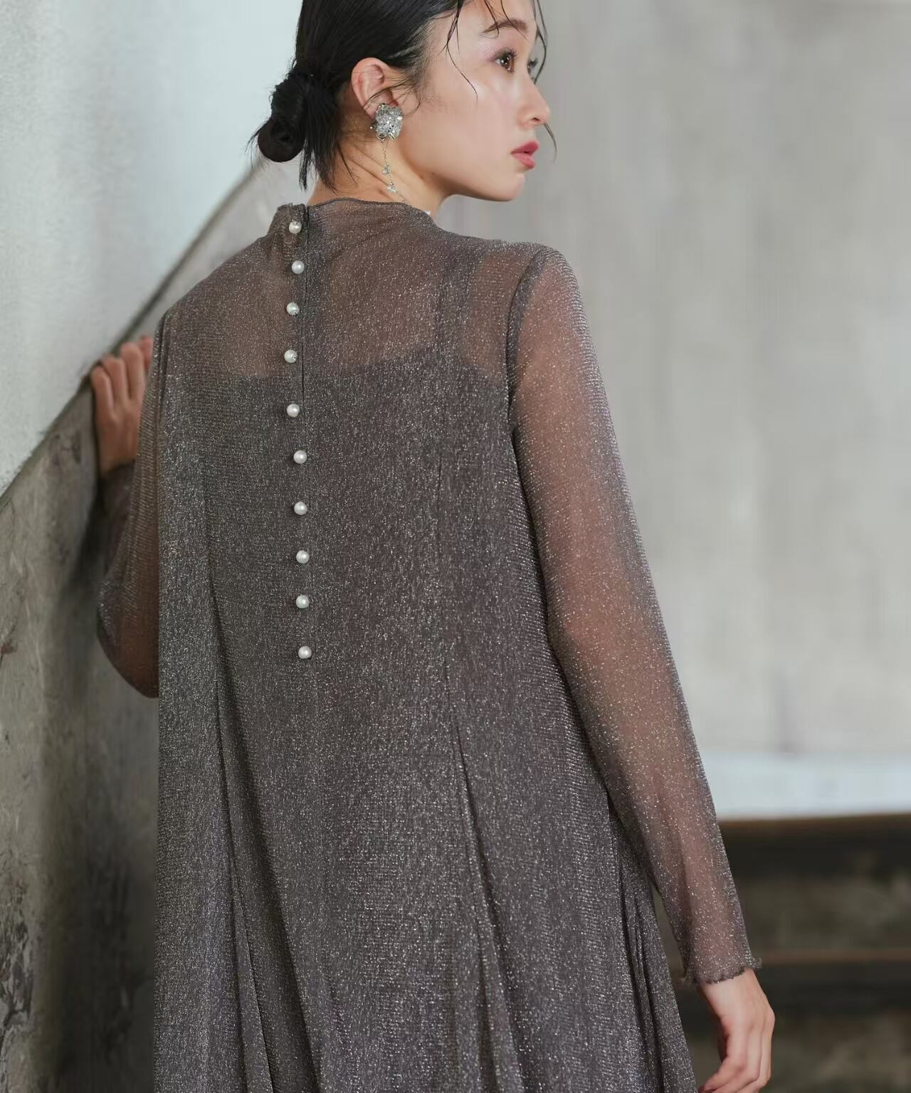 aラインのシルエットにバックパールが映えるデザイン。