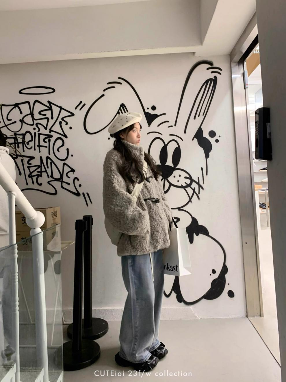大人可愛いグレーカラーでスタンドカラーのボアコート。