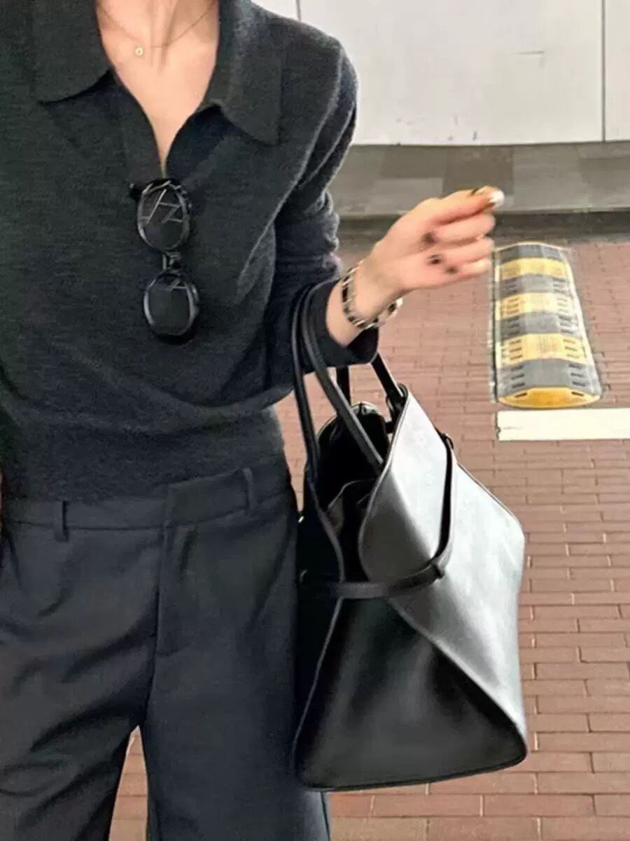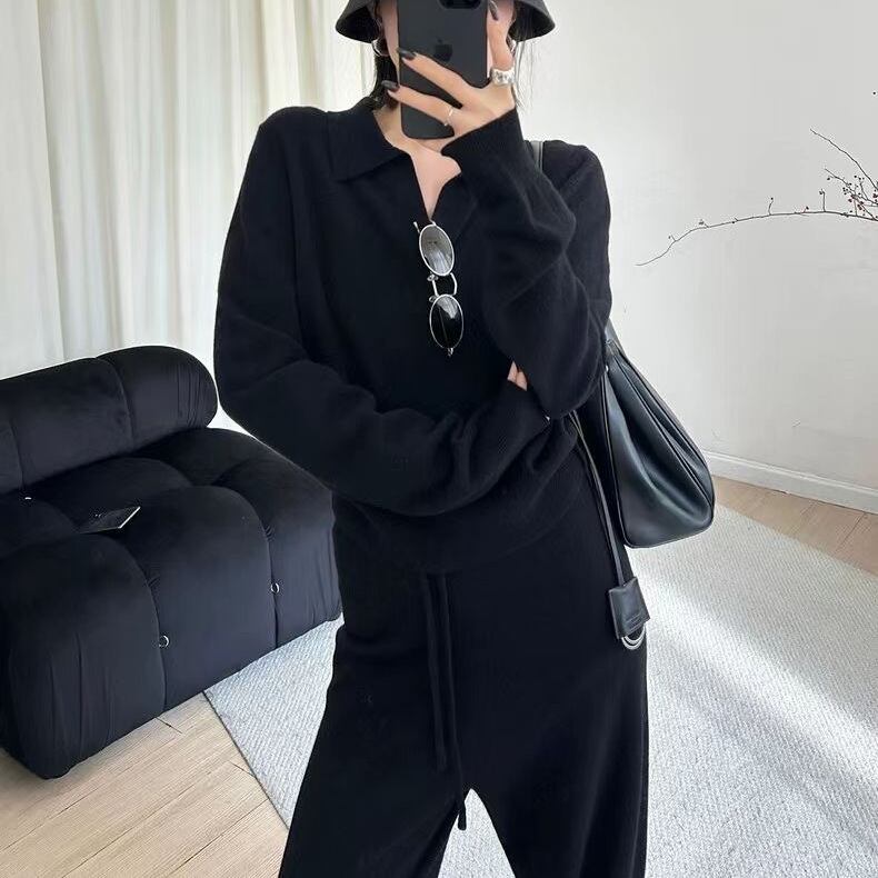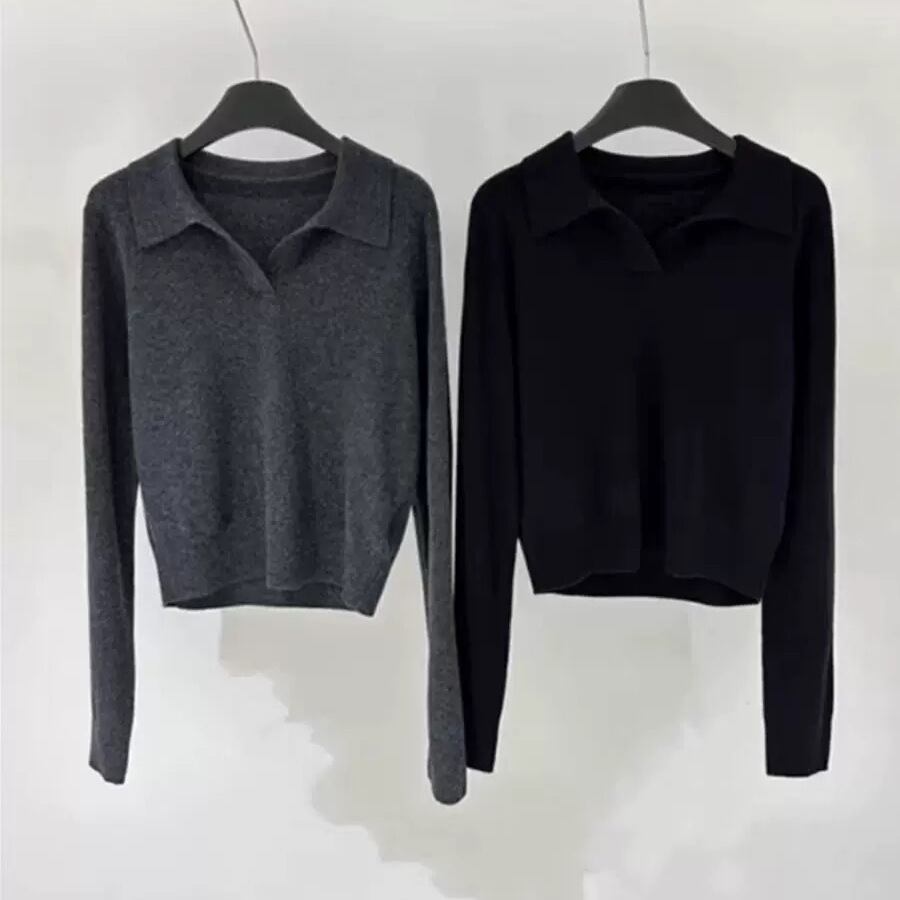 大人エレガントなポロ襟のシンプルなニットセーター。
