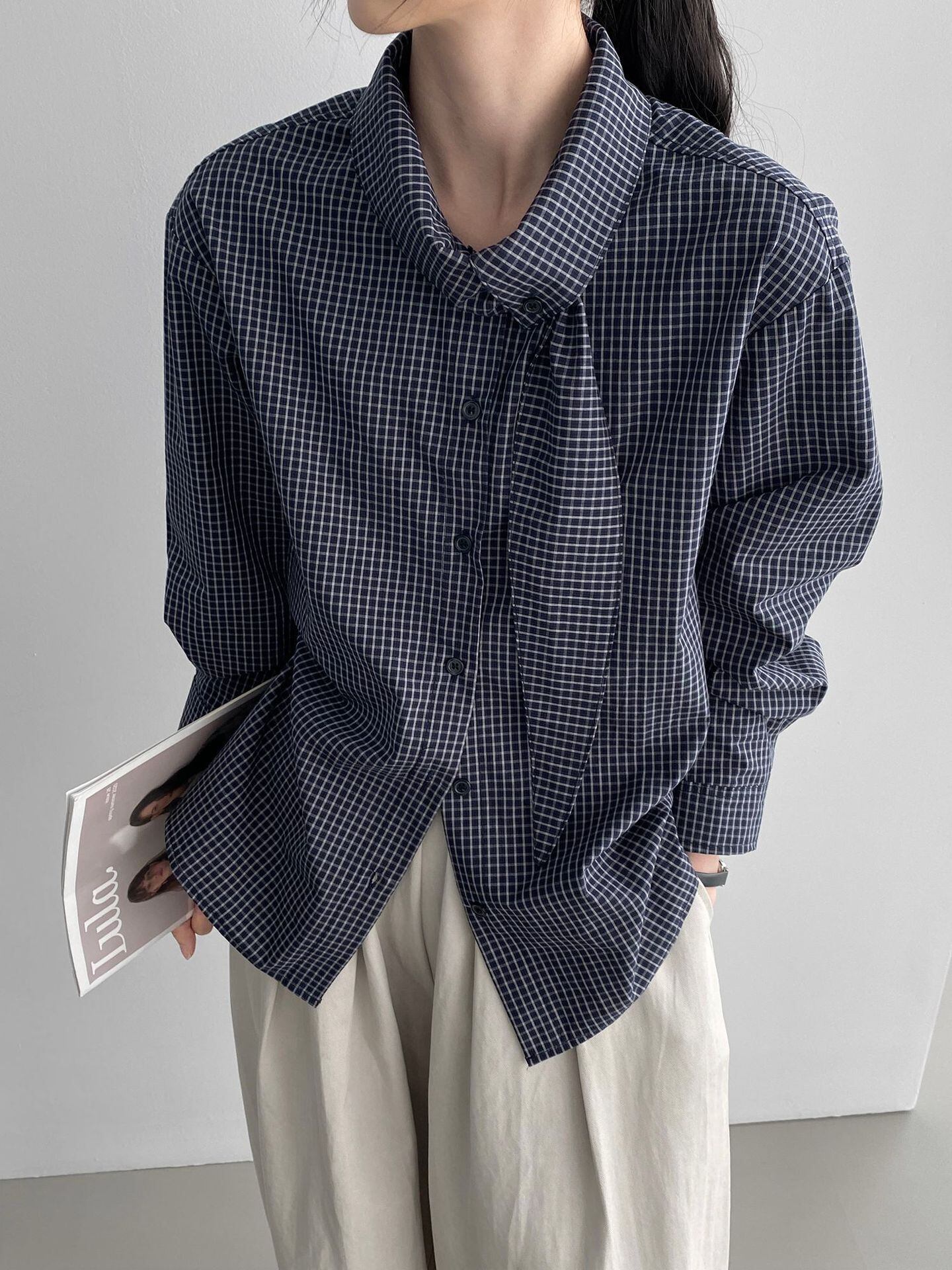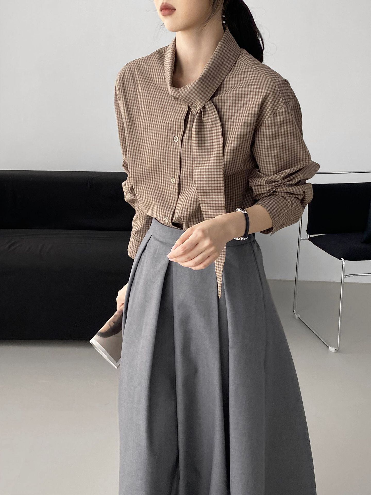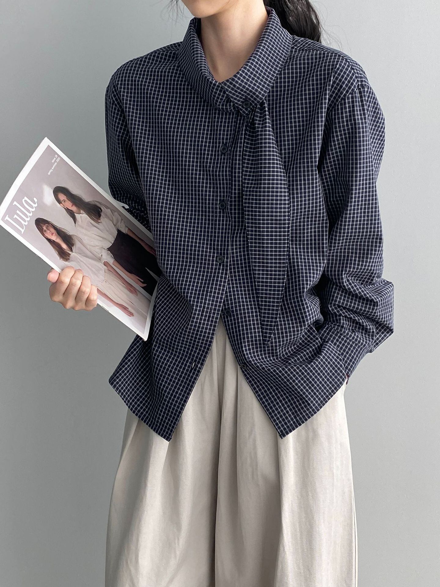 大人可愛いチェック柄のボウタイブラウス。