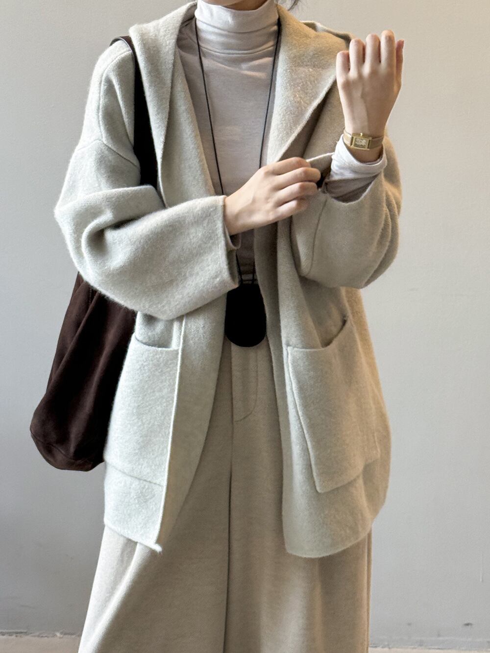 フード付きでお首まわりまであたたかくポケット付きで小物もしまえる。