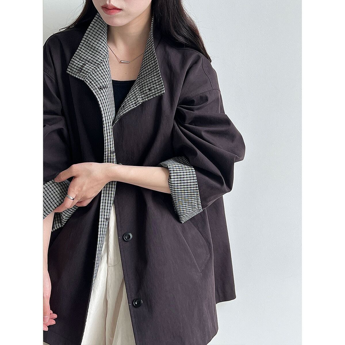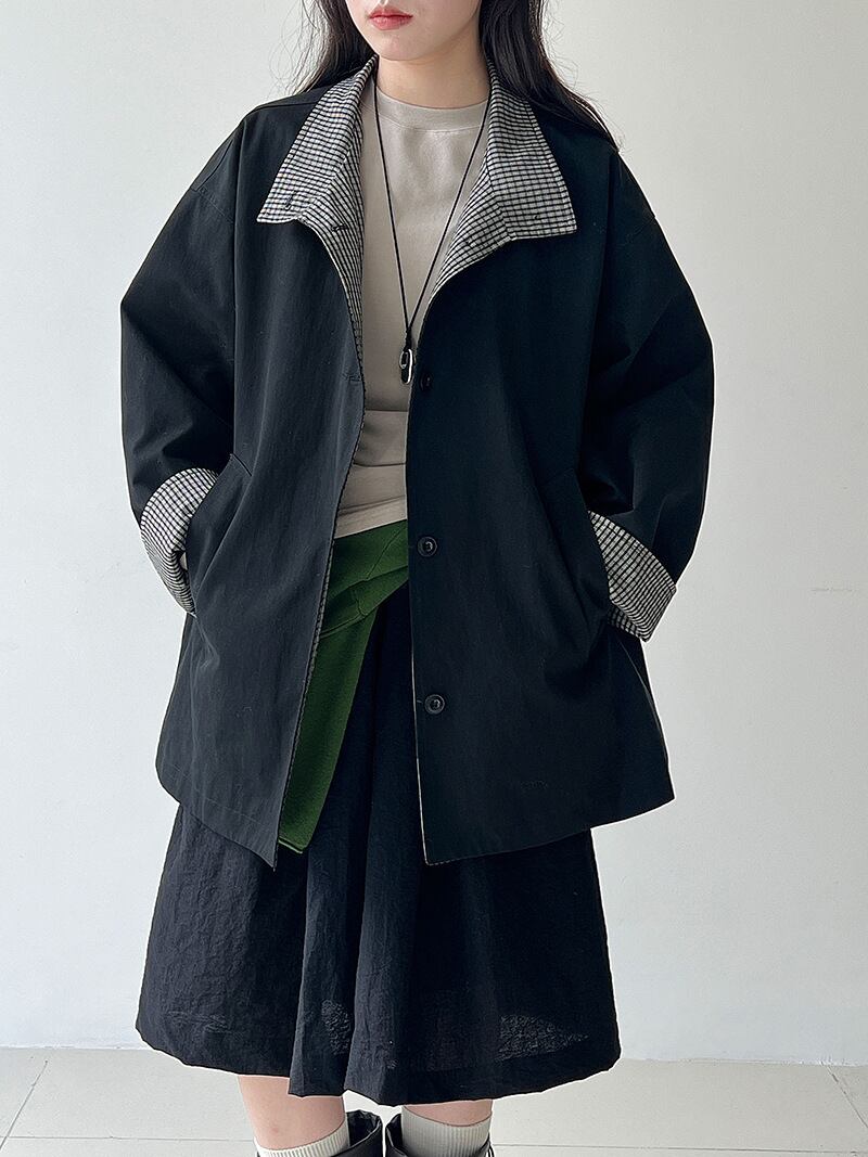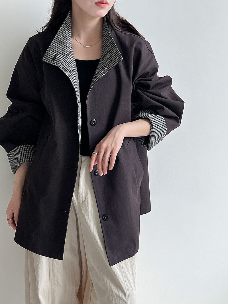 裏地がチェック柄の大人可愛いステンカラーコート。