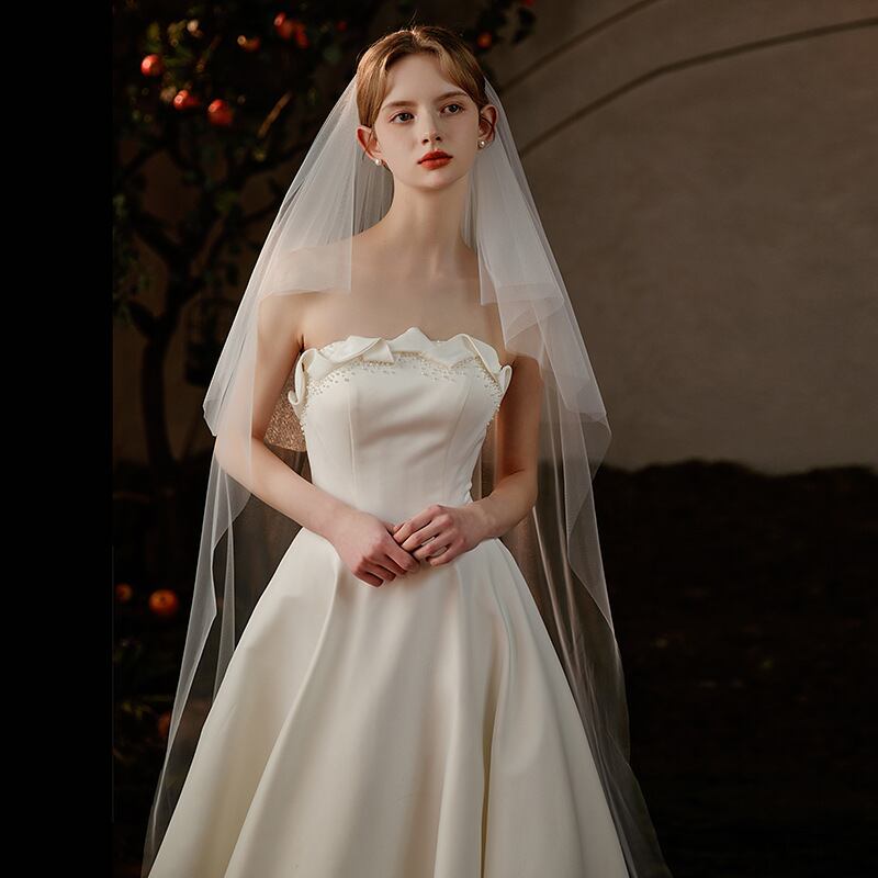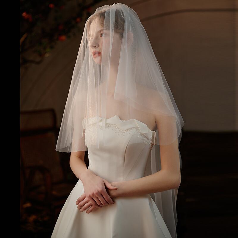 余計な装飾のないシンプルなロング丈のウェディングベール。