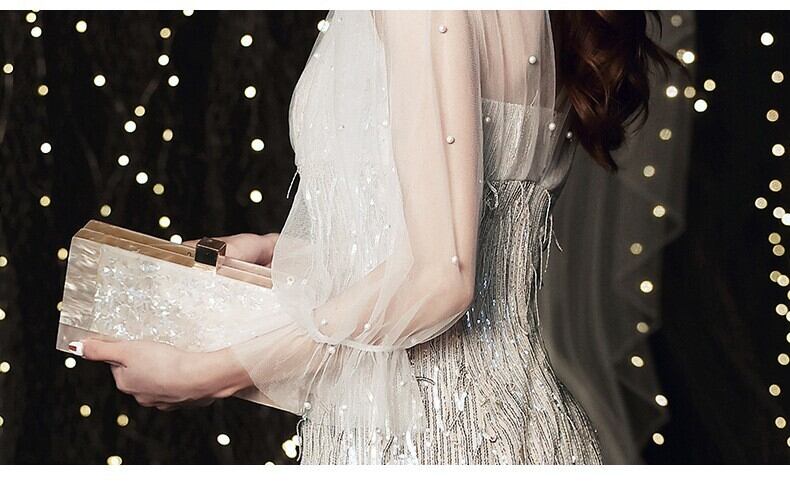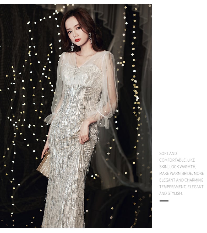 ラメ感がきらびやかなマ―メイドラインのパーティードレス。