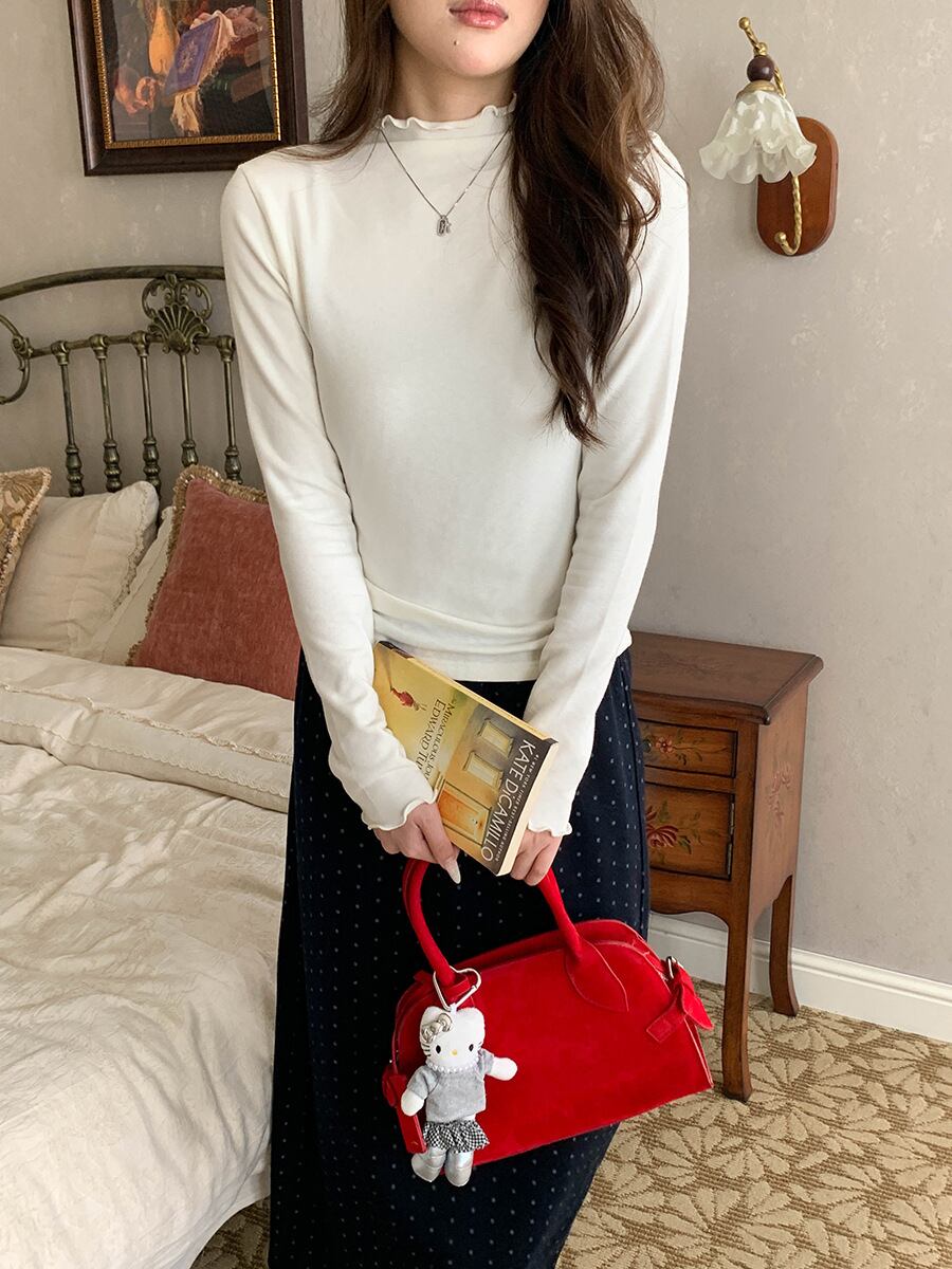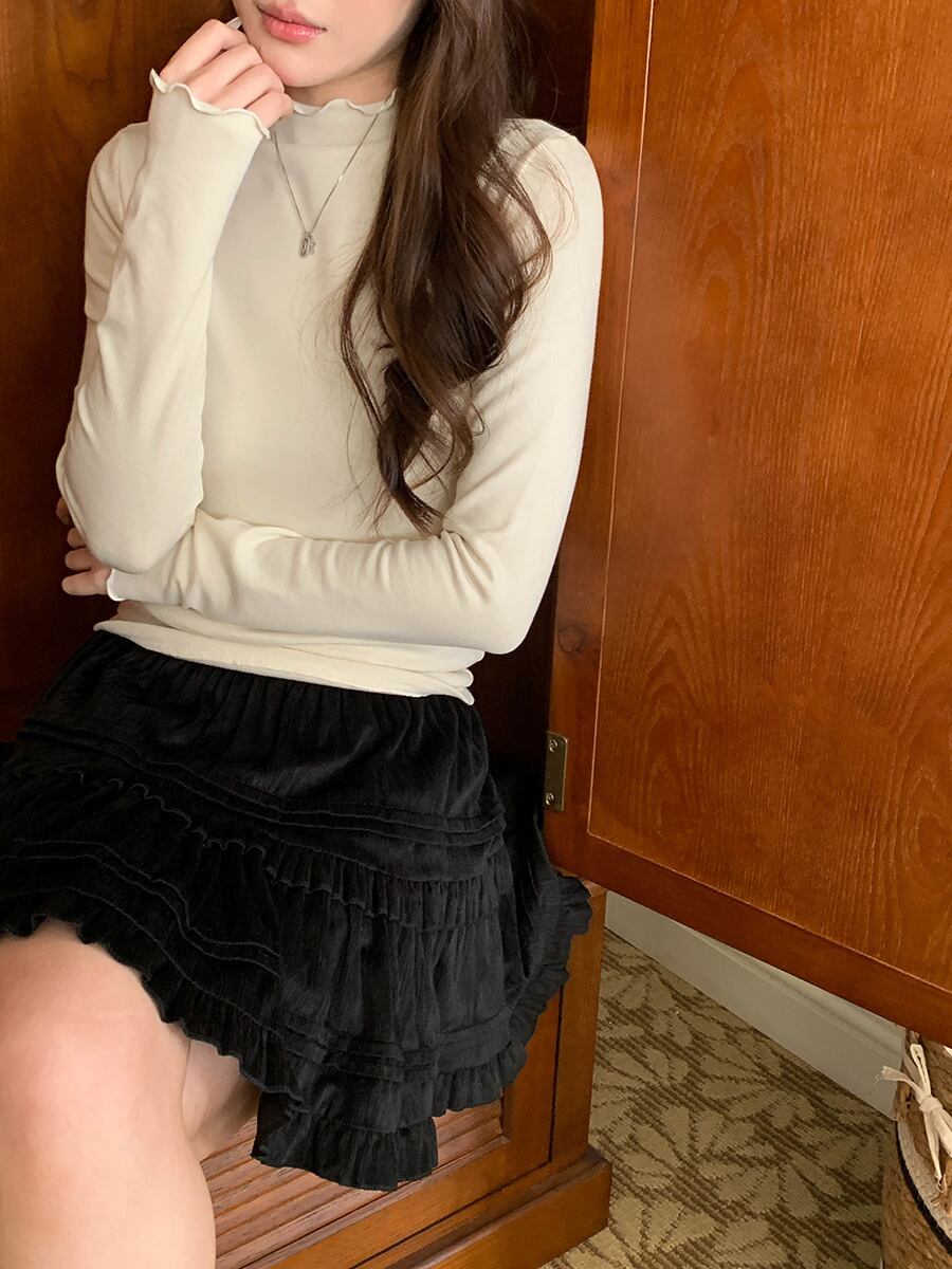 襟のフリルが大人可愛いハイネックカットソー。