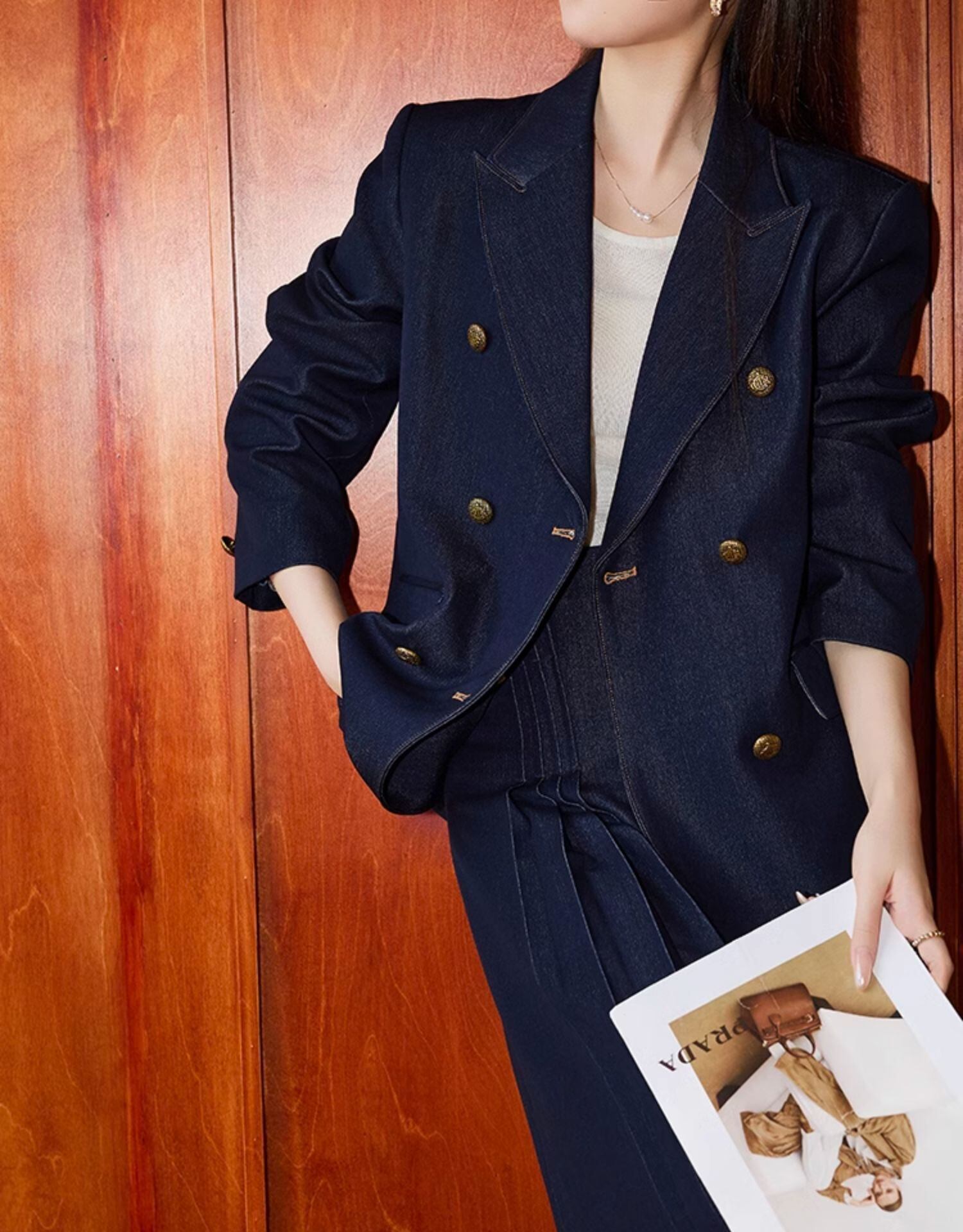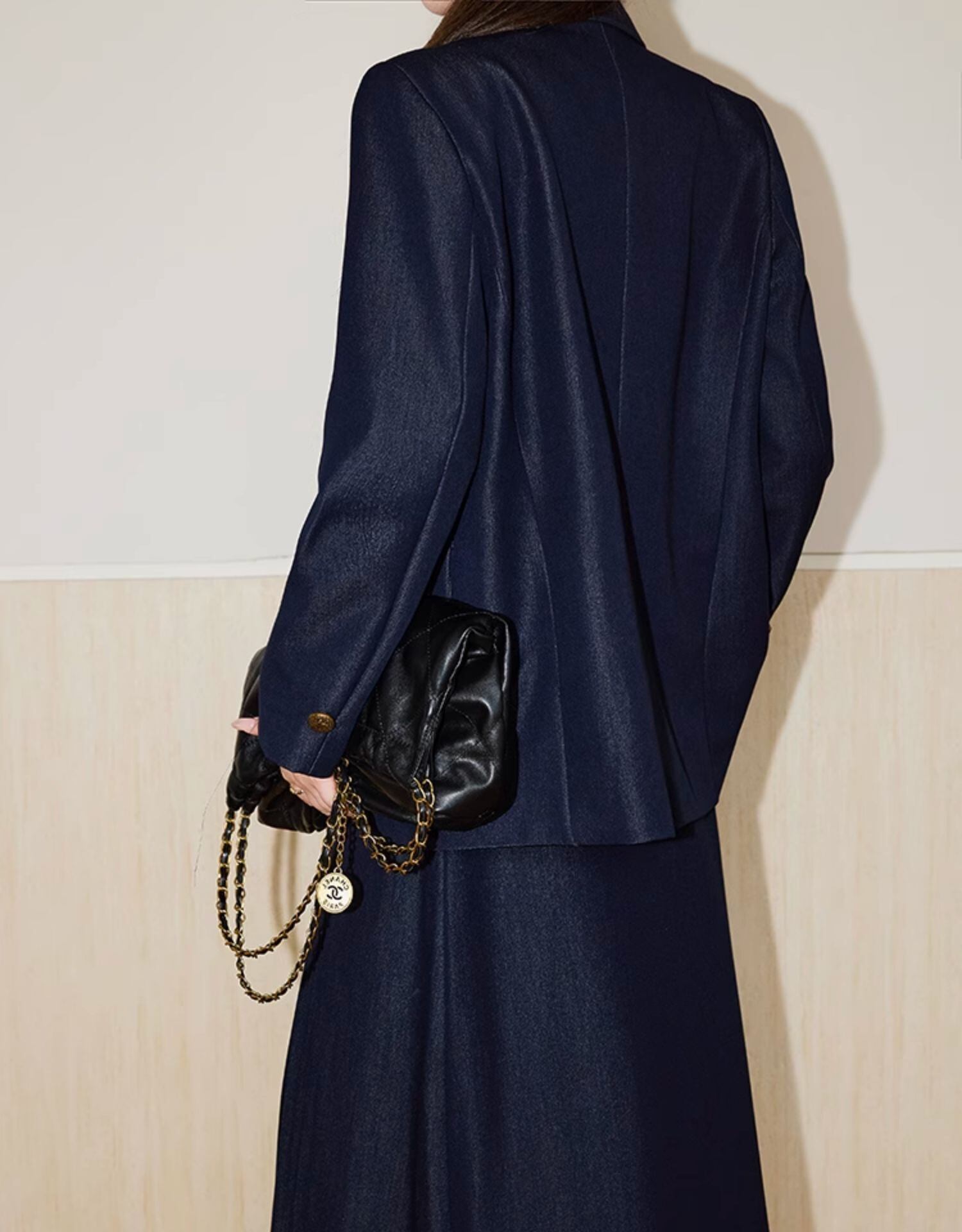 大人可愛いデニム生地のジャケット+プリーツスカートのセットアップ。