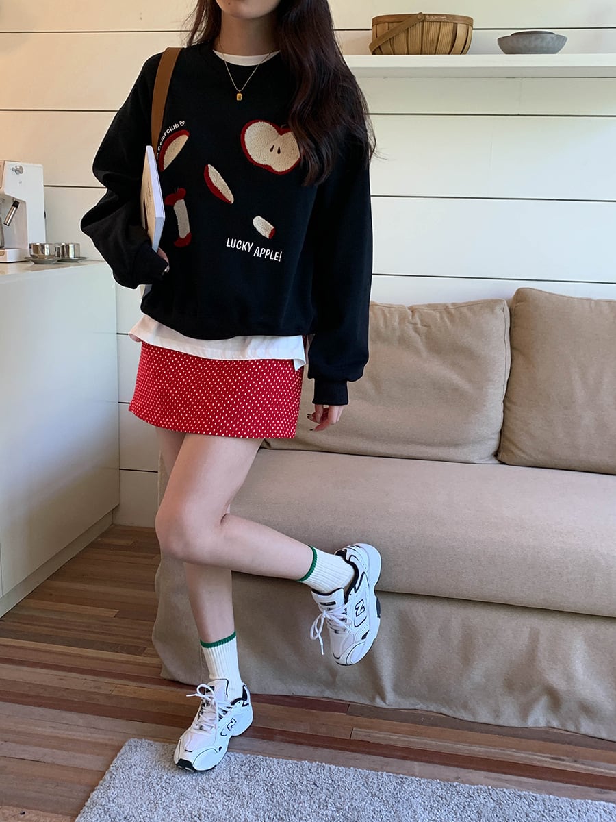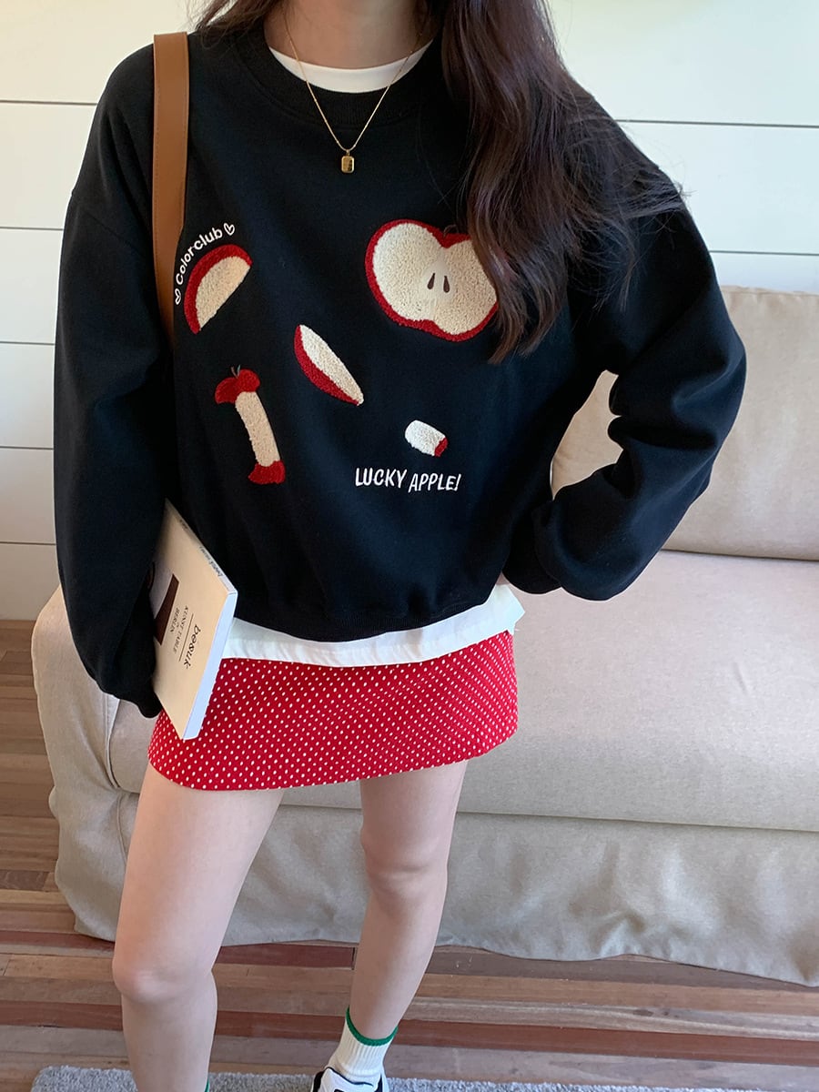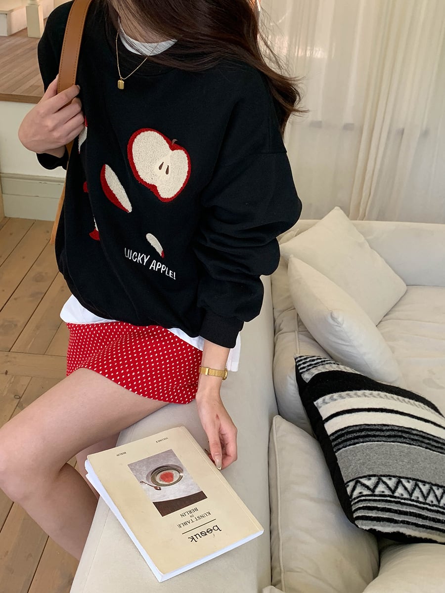 センターのりんごモチーフが大人可愛いスウェットトレーナー。