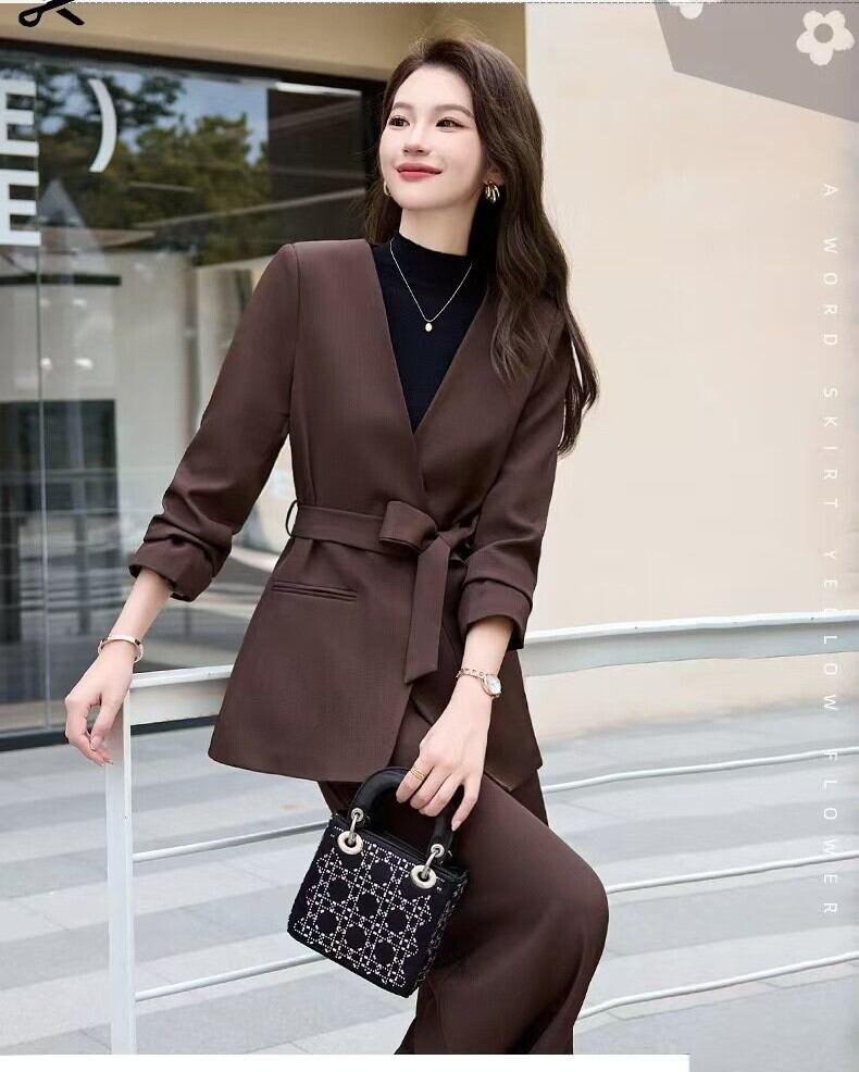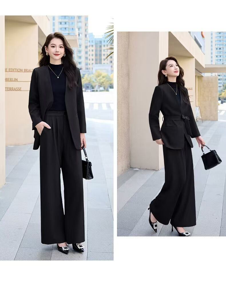 大人エレガントなノーカラージャケット+ワイドパンツのセットアップスーツ。