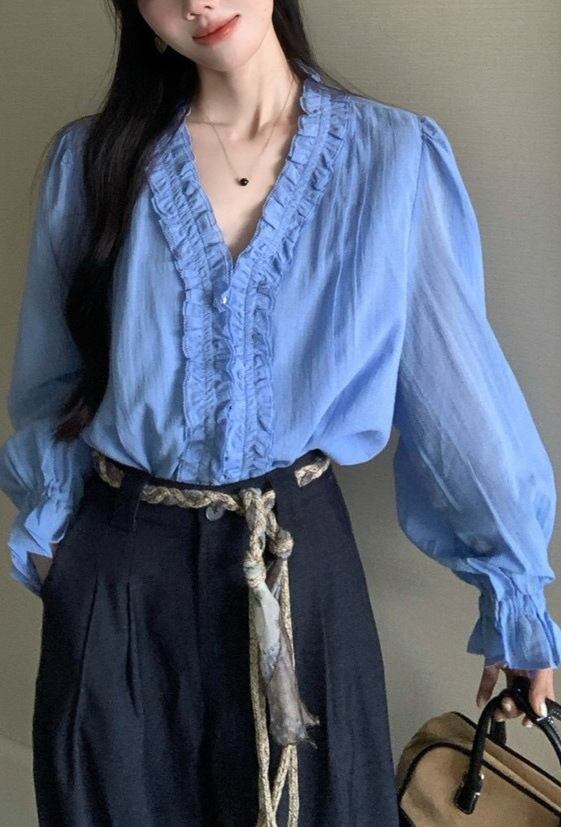 フリルが大人可愛いvネックのシンプルなブラウス。