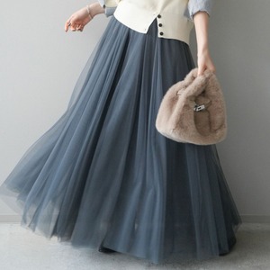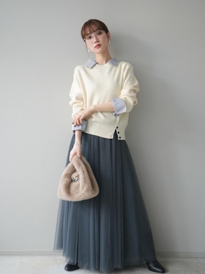 大人エレガントなニットトップス+チュールスカートのセットアップ。