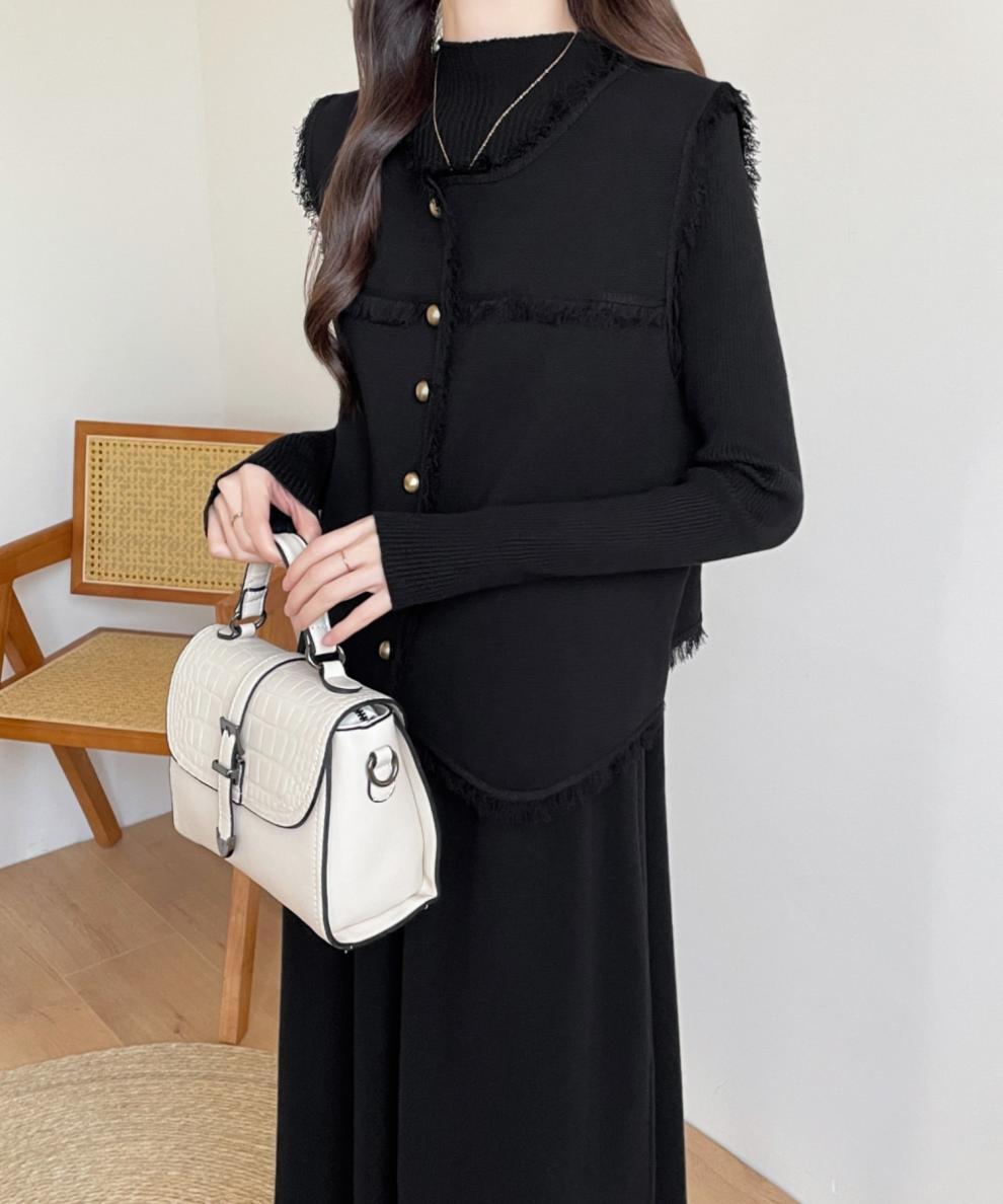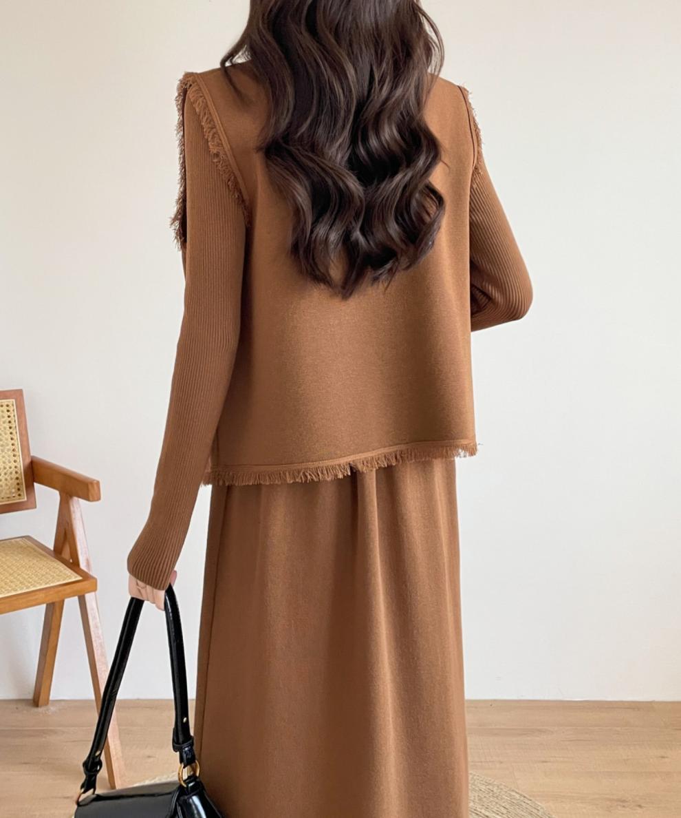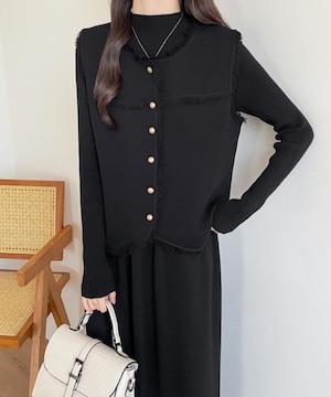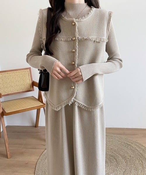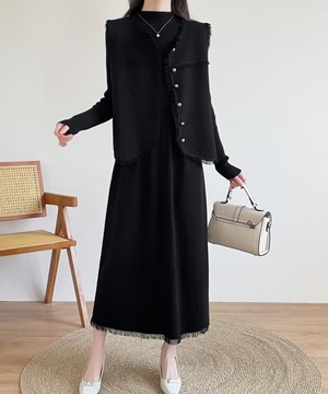 大人エレガントなジレベスト+ニットワンピースのセットアップ。