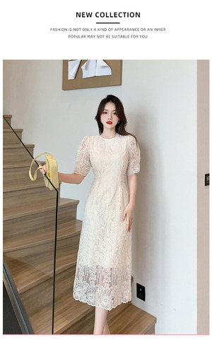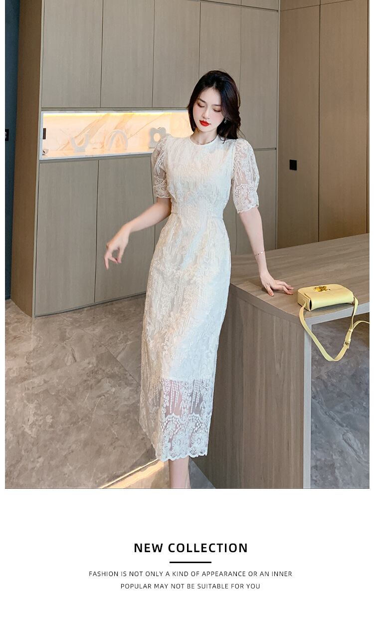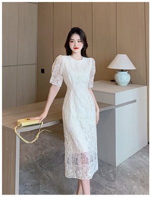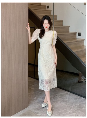 大人可愛い総レースのミモレ丈パーティードレス。