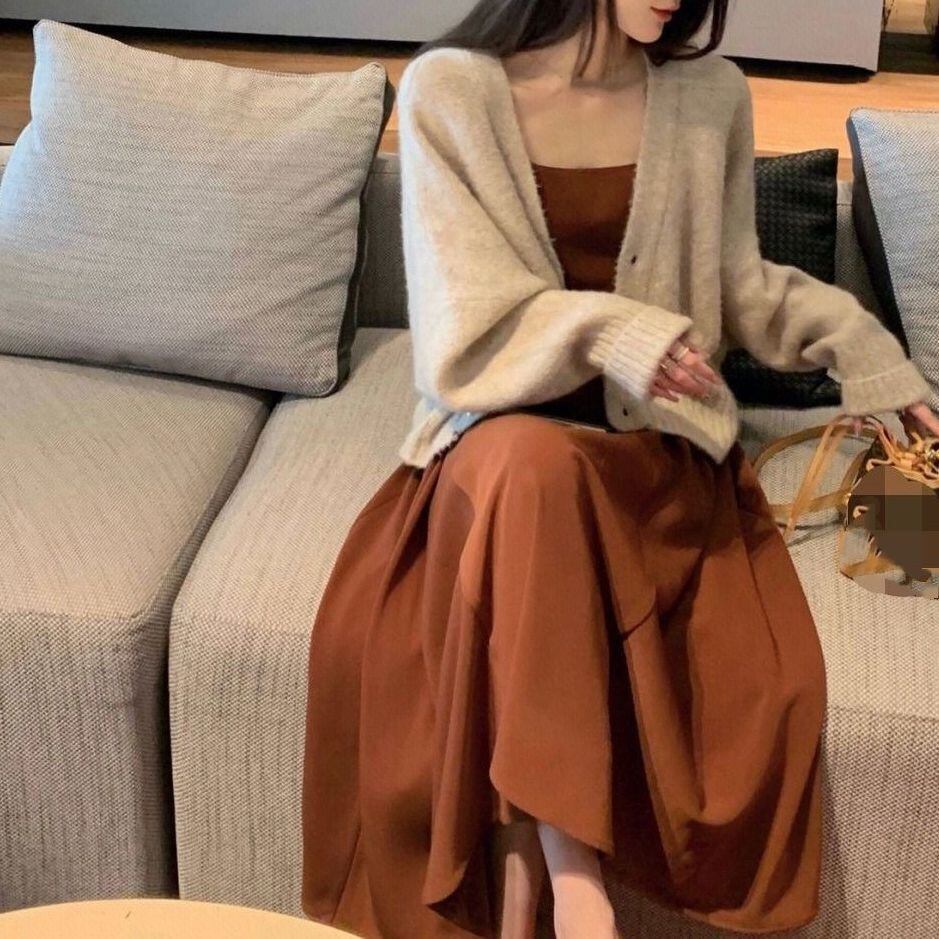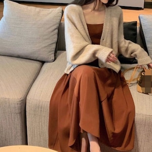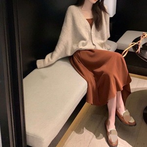 大人エレガントなニットカーディガン+キャミワンピースのセットアップ。