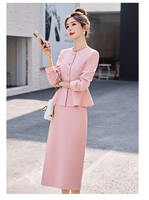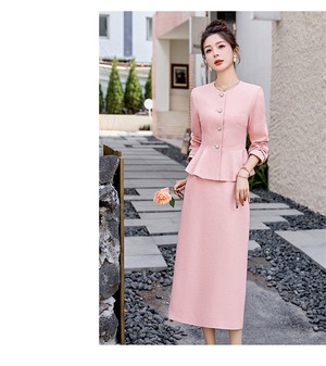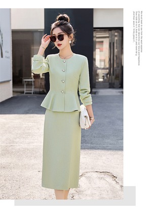 大人エレガントなペプラムジャケット+タイトスカートのセットアップ。