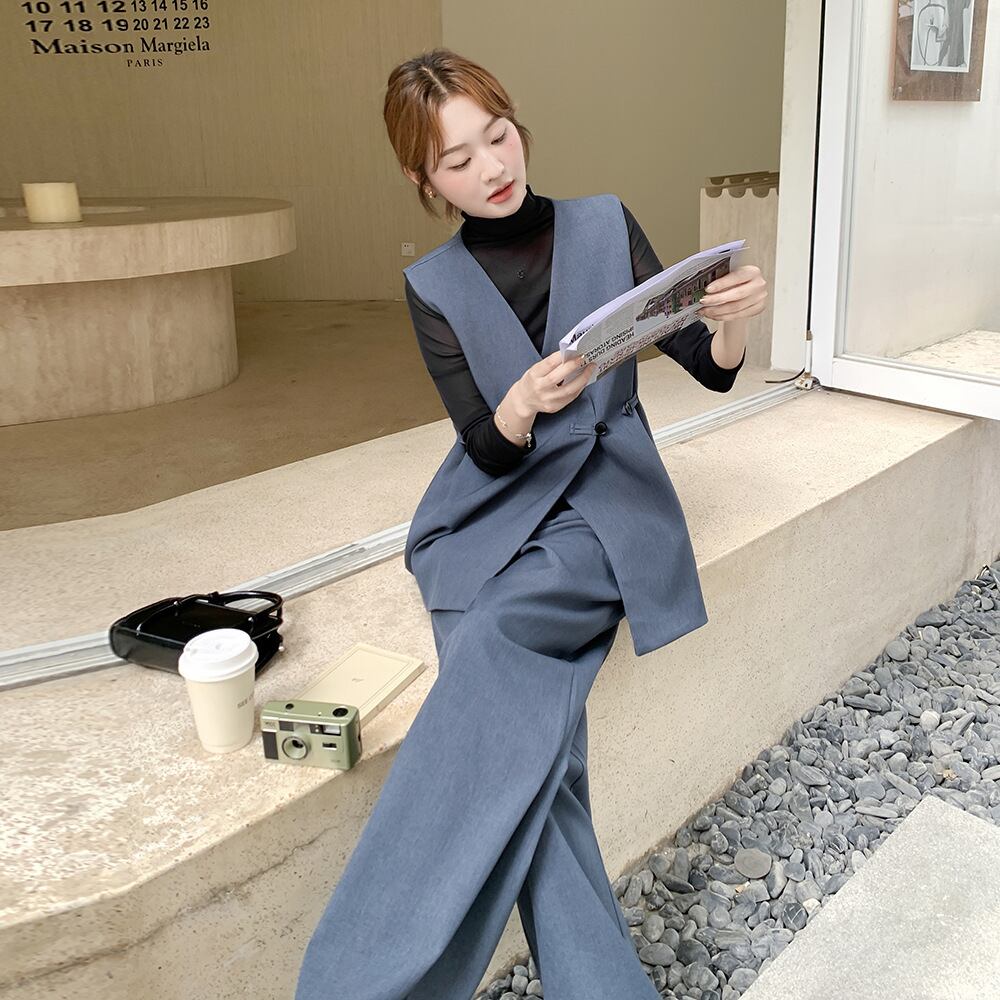 【セットアップ】 セットアップ レディース おしゃれ ママ ワイド パンツ ジレ ベスト 春 秋 冬 20代 30代 40代 きれいめ カジュアル 卒園式 入園式 卒業式 入学式 オケージョン ベージュ ブルー 青 S M L XL