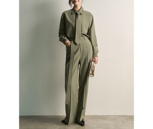 大人かっこいいタイ付きシャツ+ワイドパンツのセットアップ。
