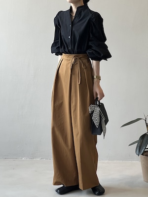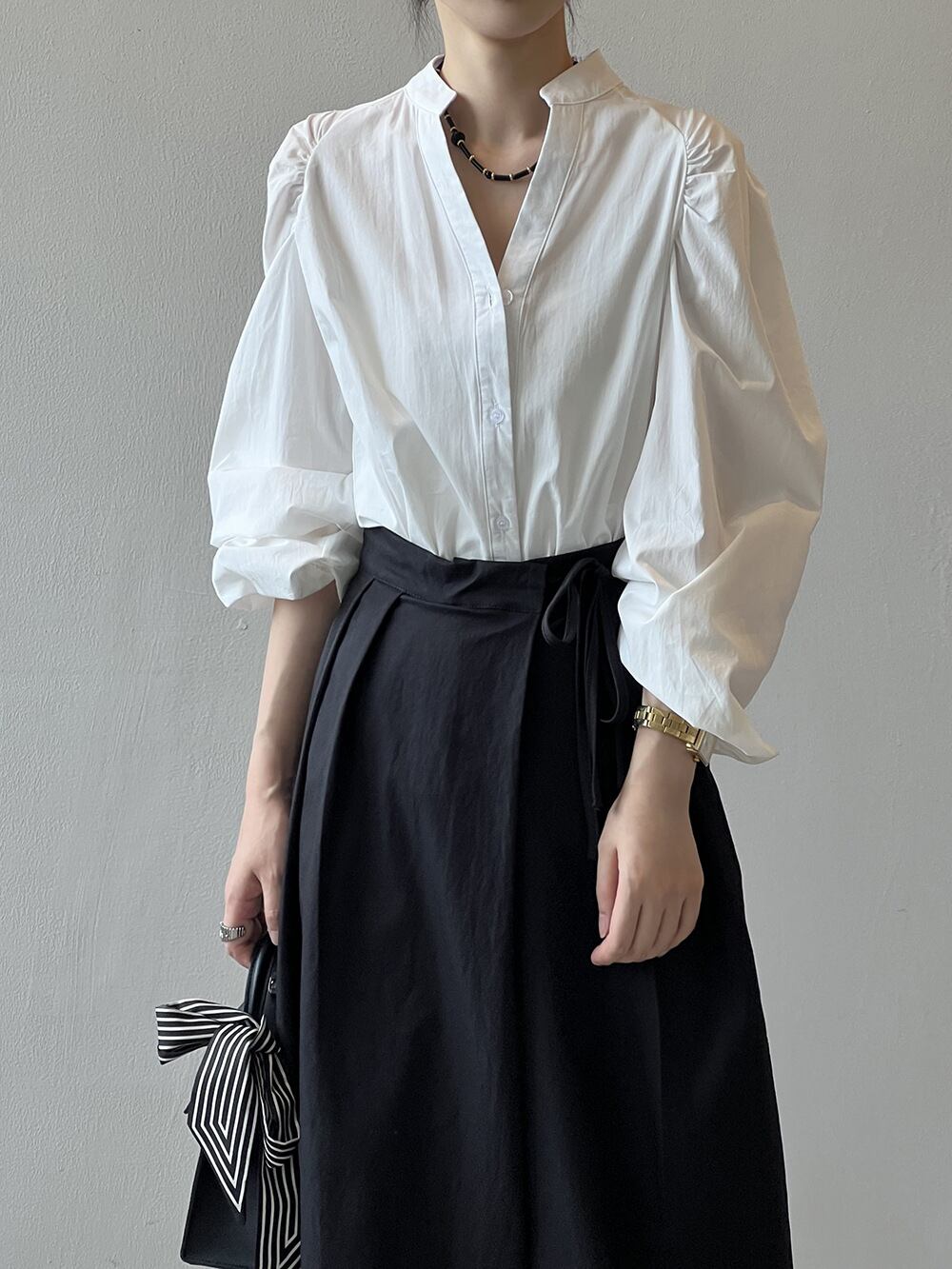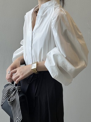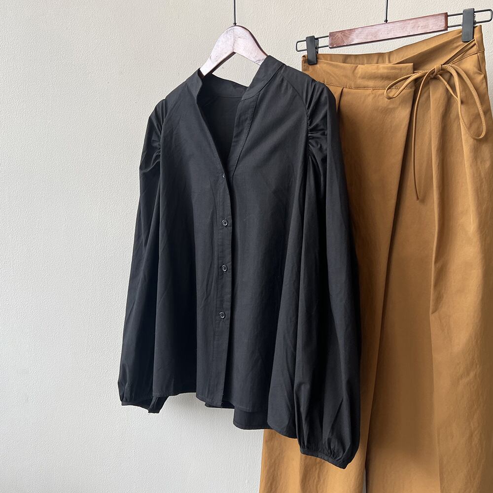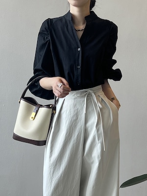 大人可愛いシンプルなノーカラーシャツ。