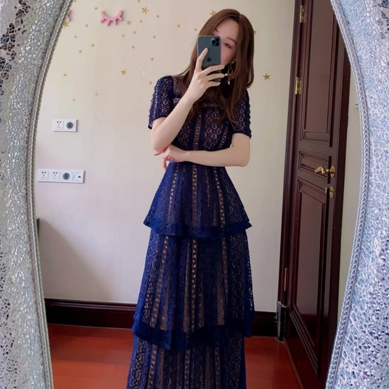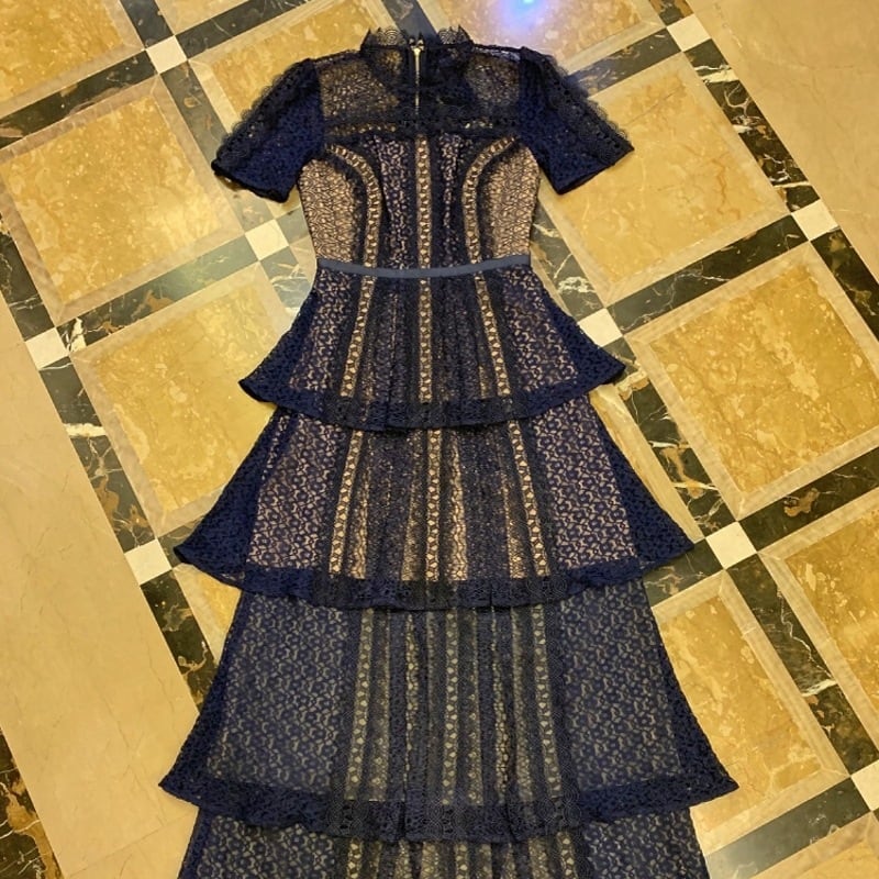 大人エレガントな総レースのティアードパーティードレス。