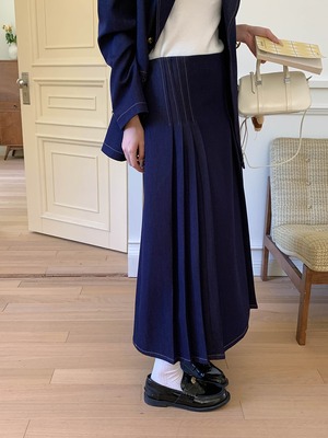 大人可愛いデニムジャケット+プリーツスカートのセットアップ。