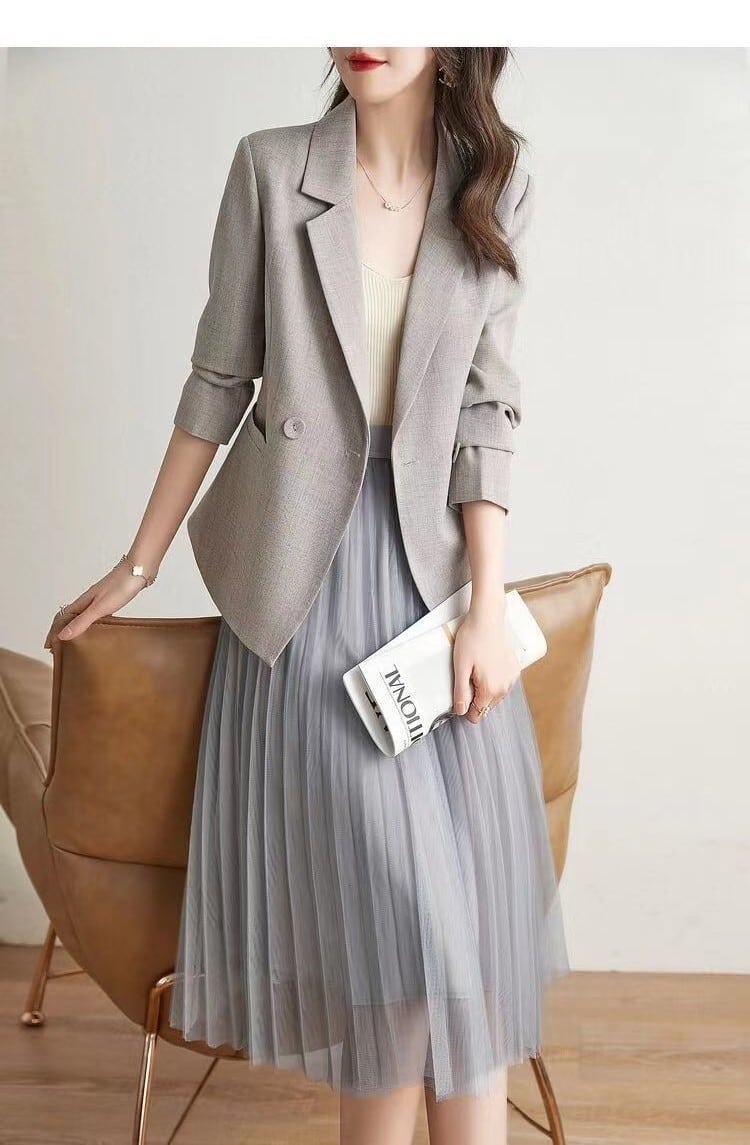 コンパクトなジャケットと透け感あるスカートで上品な大人の女性に。
