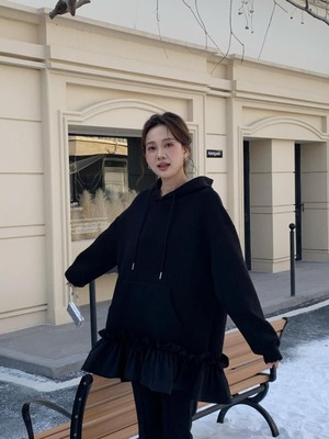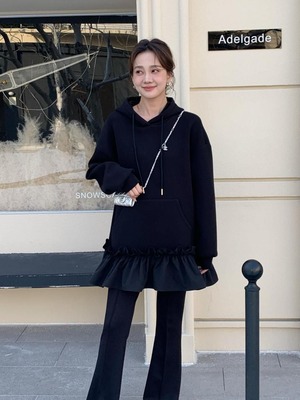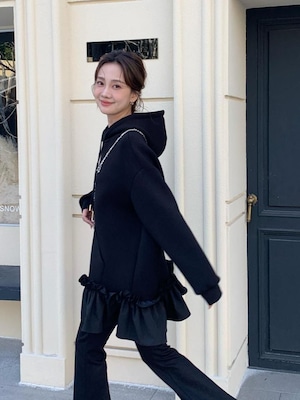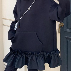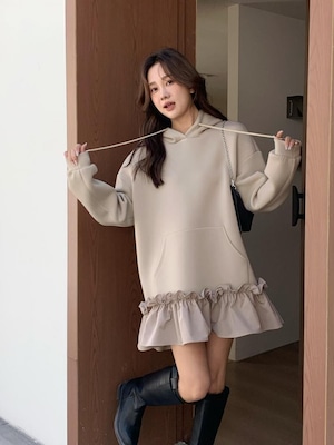 一枚でミニスカートでも着用いただけるミドル丈のパーカー。