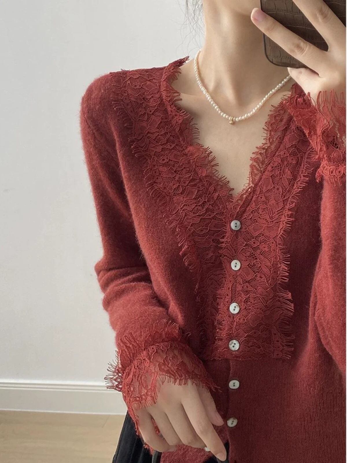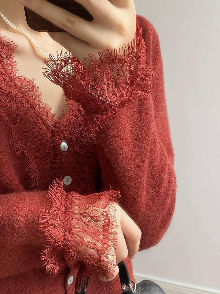 襟とお袖のレース使いが繊細で大人エレガントなカーディガン。