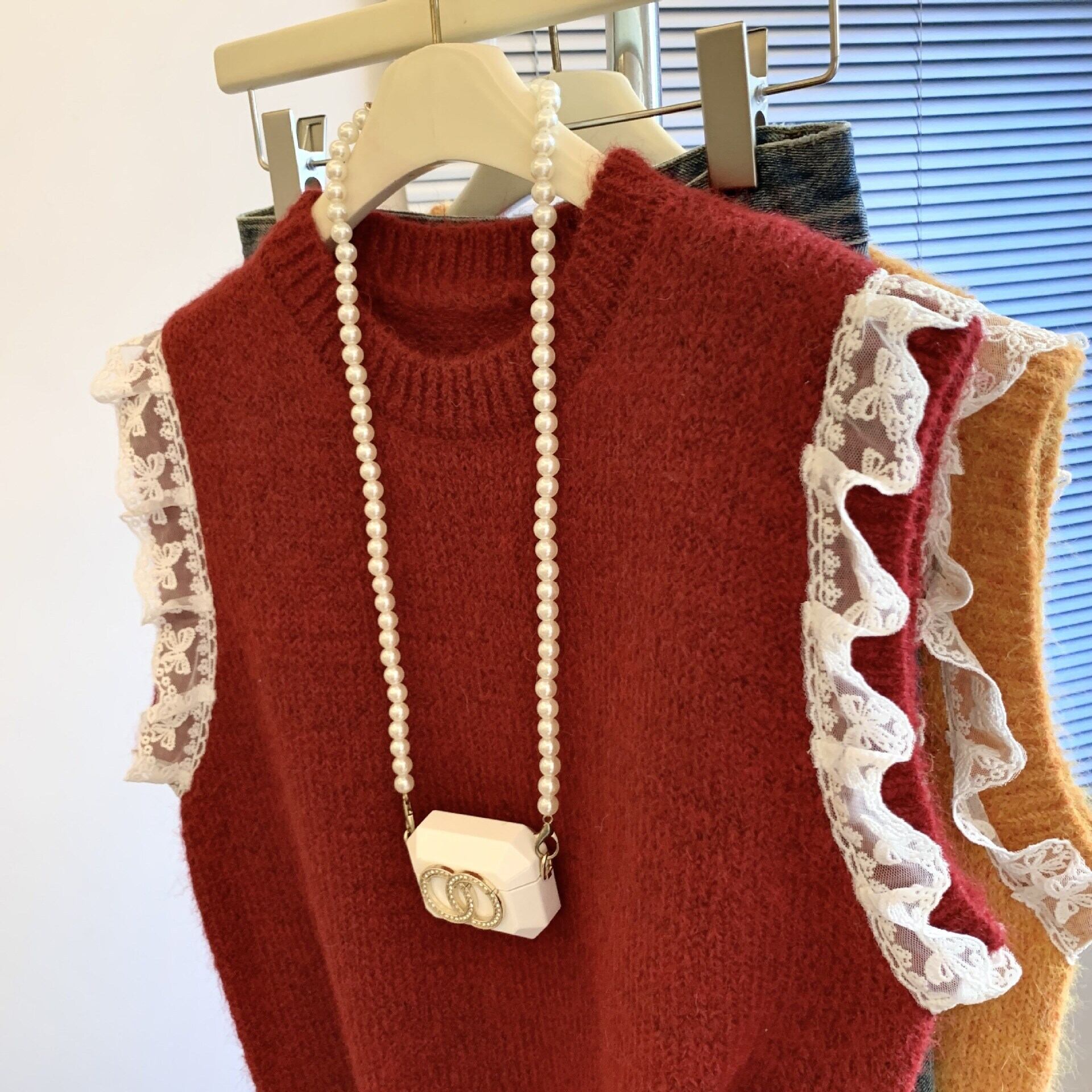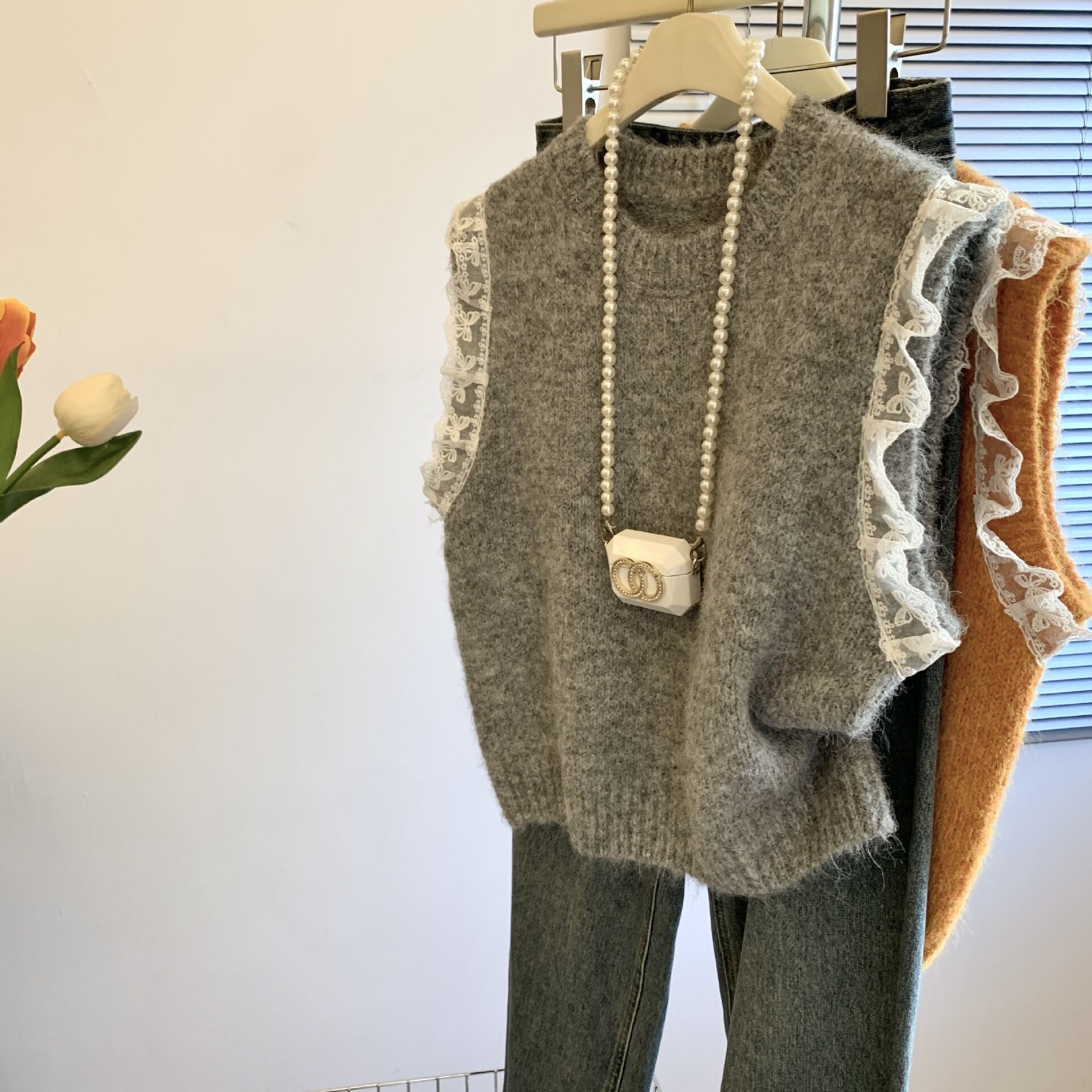 大人可愛いレース切り替えニットベスト。