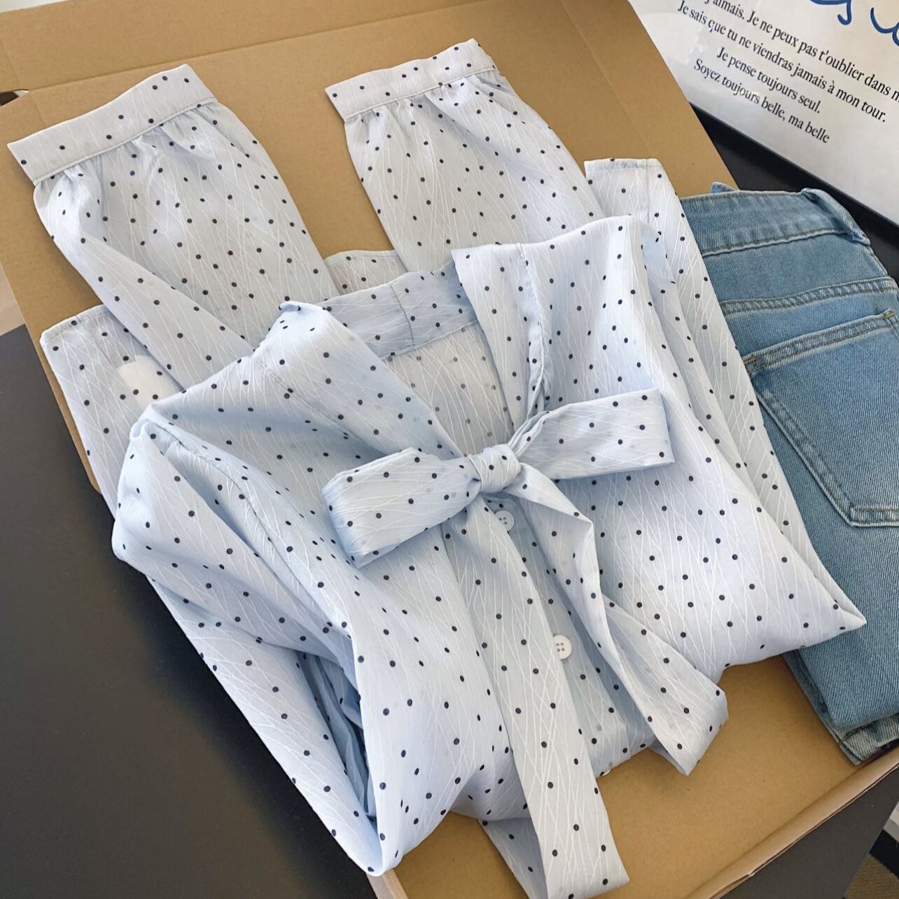 大人エレガントなドット柄のボウタイブラウス。