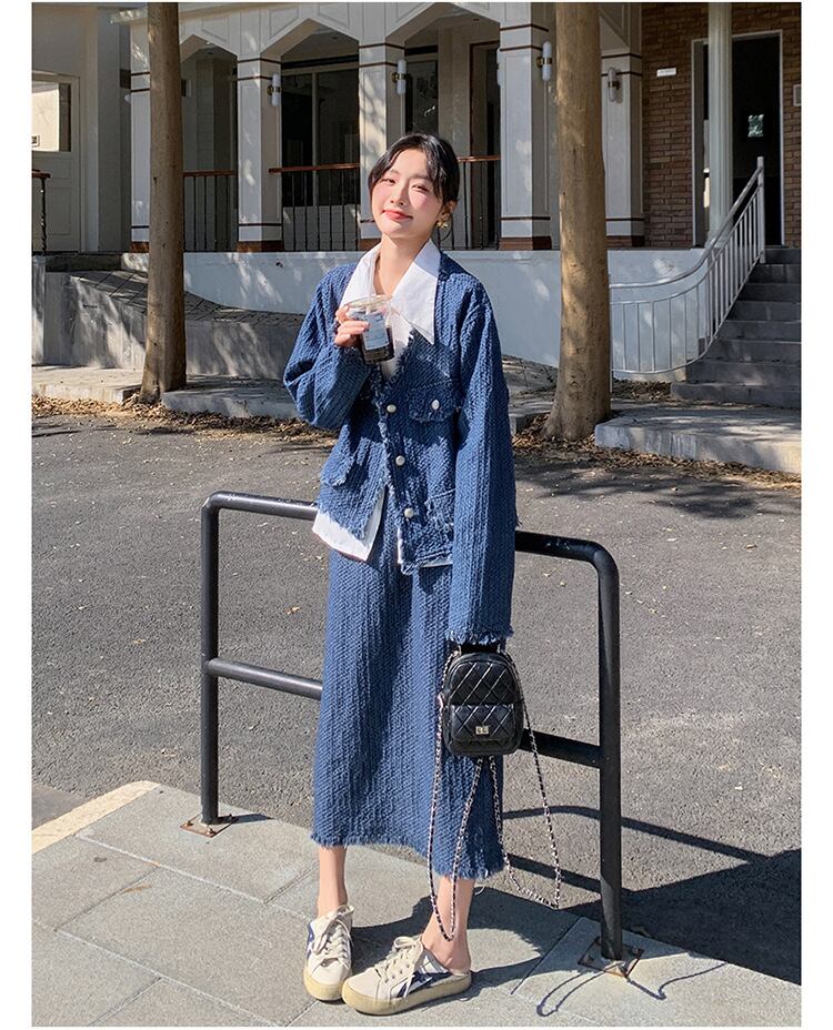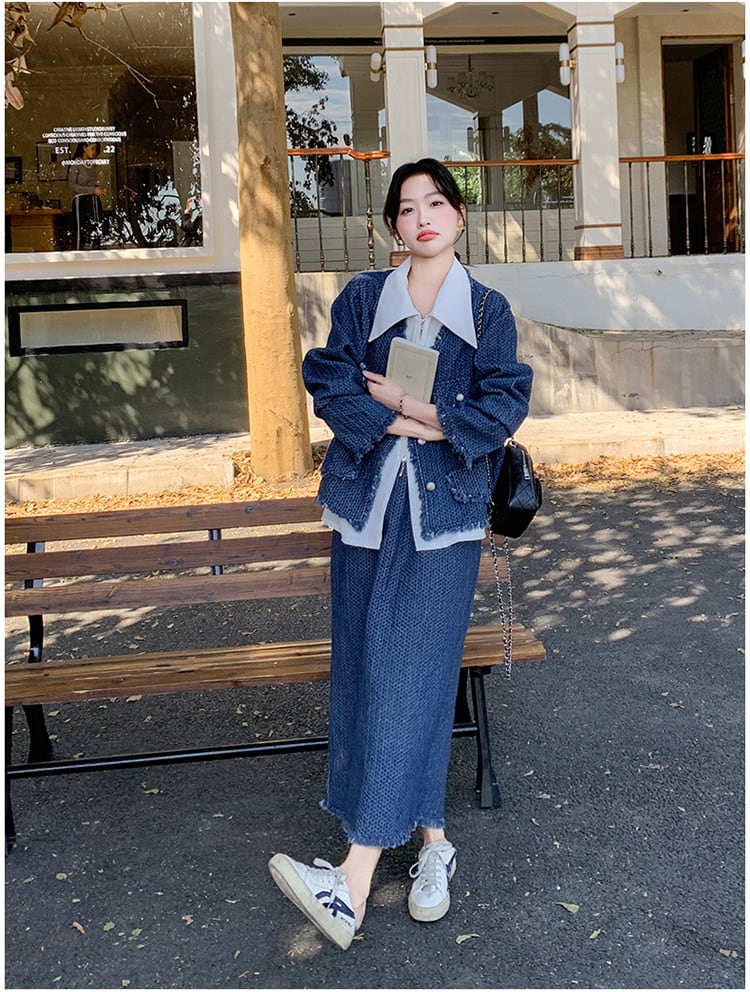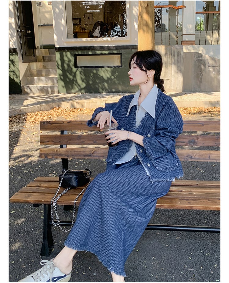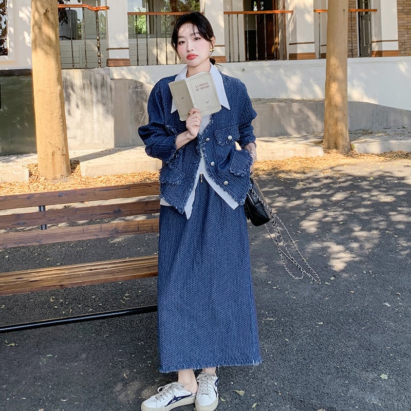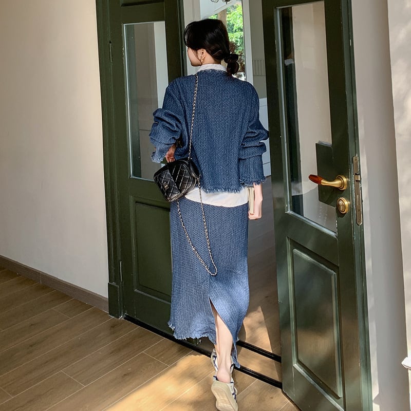 大人可愛いデニムジャケット+ブラウス+タイトスカートのセットアップ。