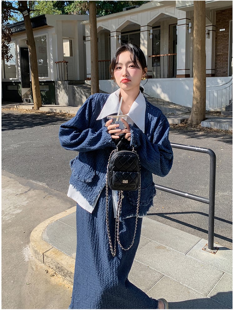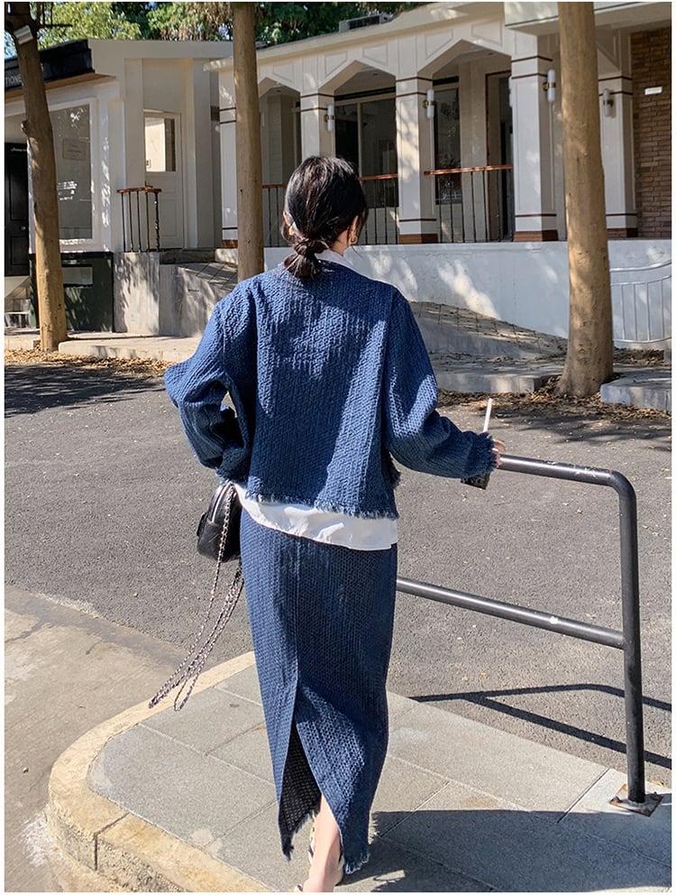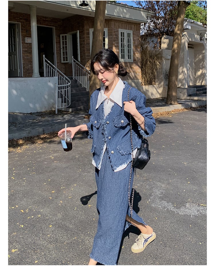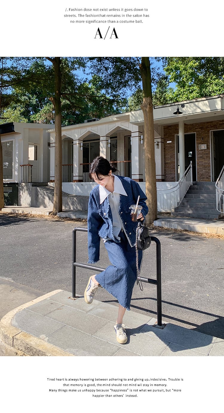 大人可愛いデニムジャケット+ブラウス+タイトスカートのセットアップ。