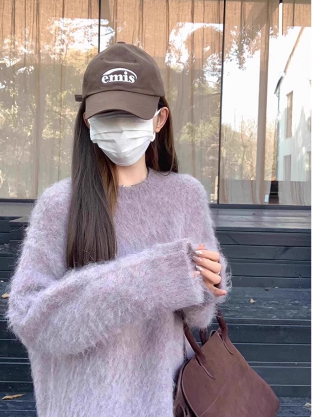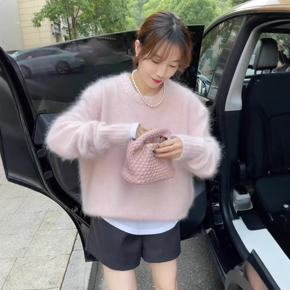 大人可愛い春色カラーのシャギーニットセーター。
