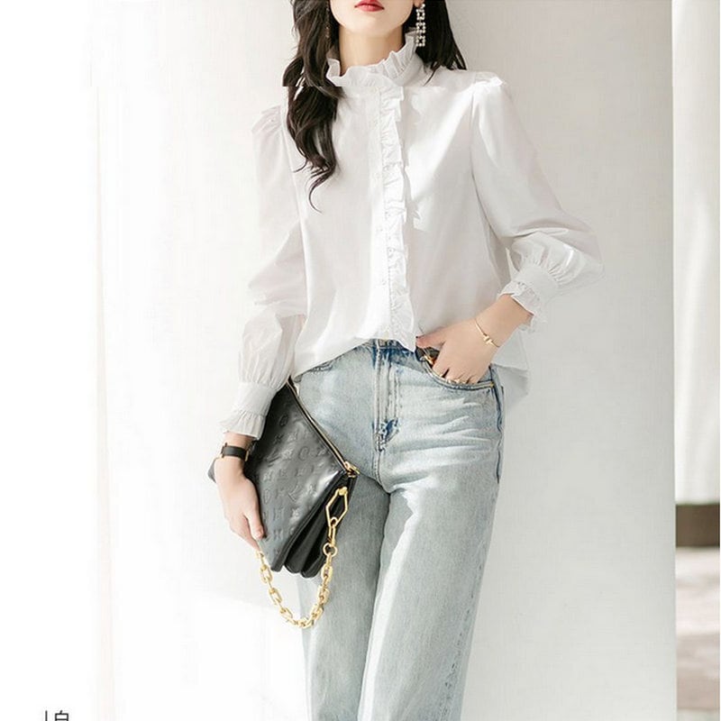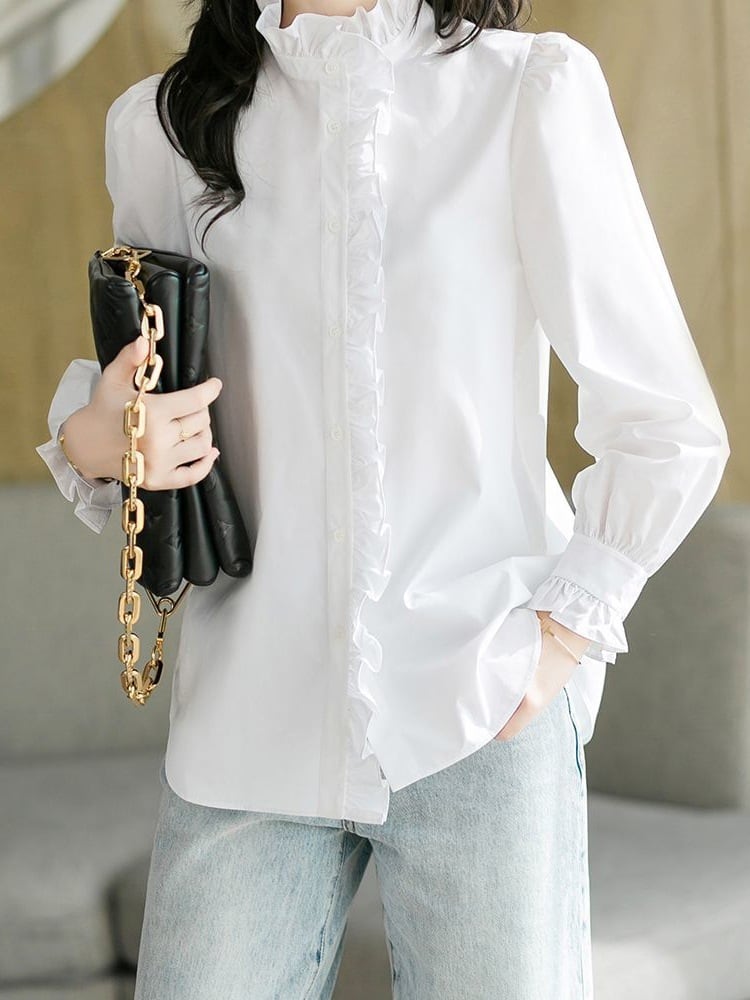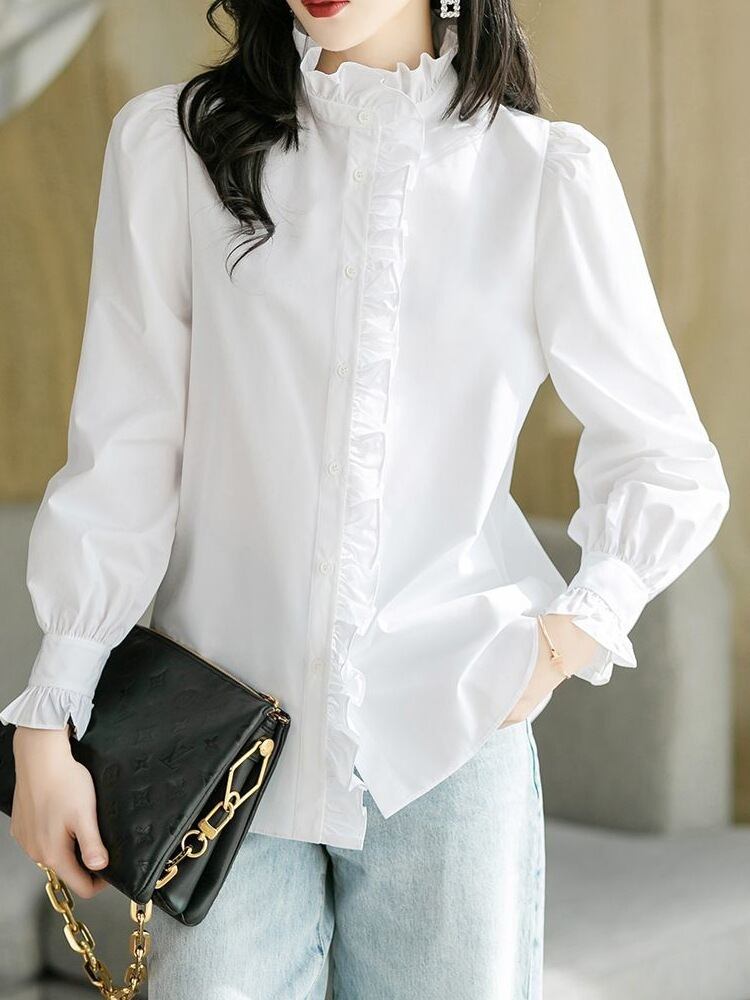 大人可愛いスタンドカラーのシンプルなブラウス。