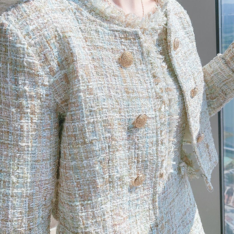 大人エレガントなミックスツイードジャケット+ワンピースのセットアップスーツ。