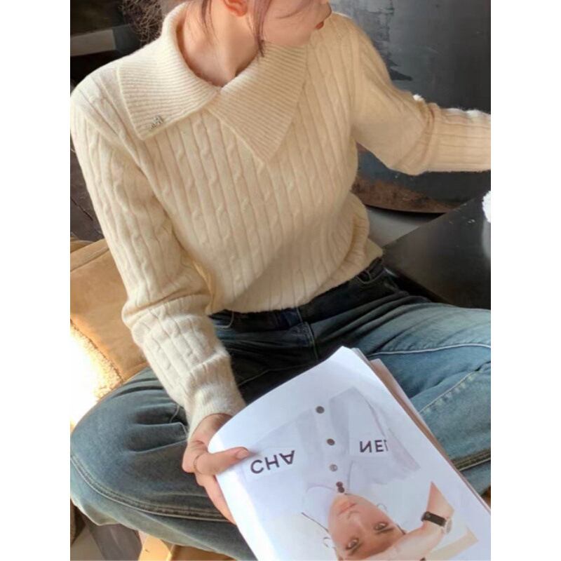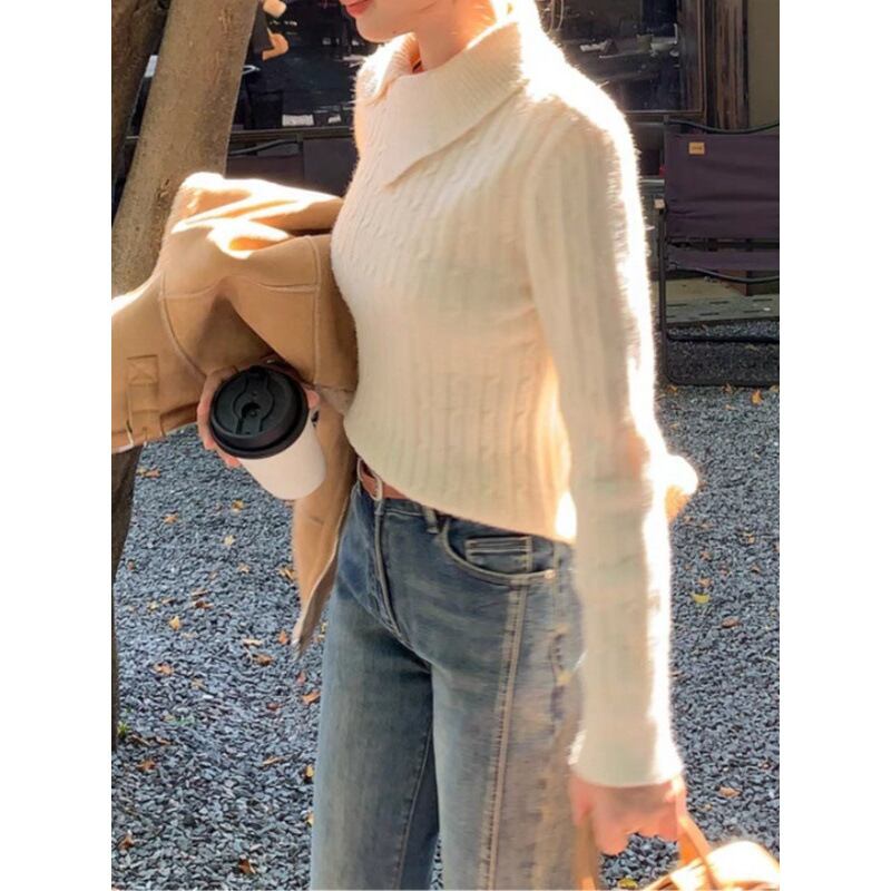 アシンメトリーな襟が目を惹くケーブルニットセーター。