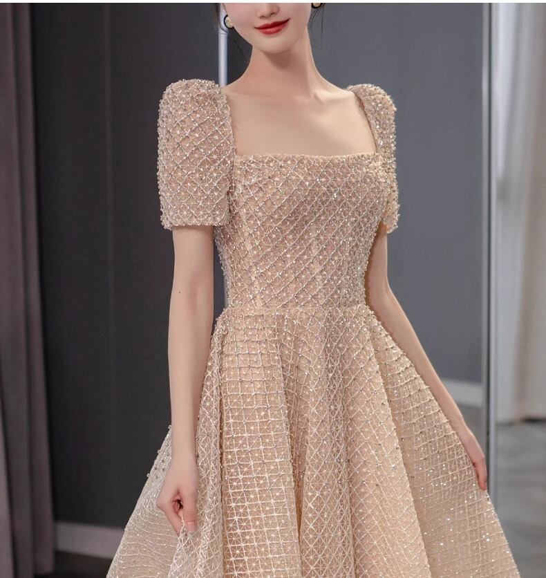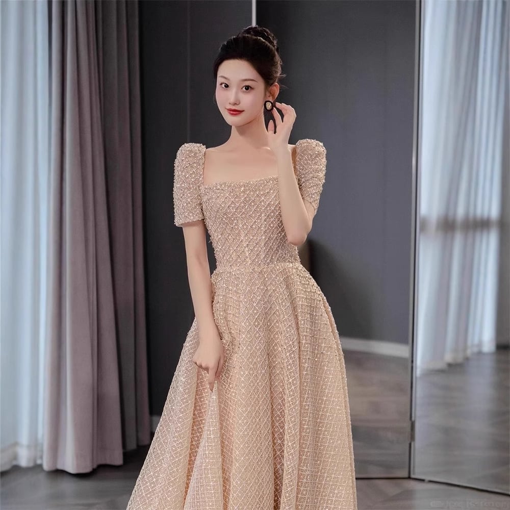 スクエアネックとパフスリーブがドレッシーなカラードレス。