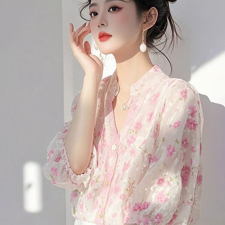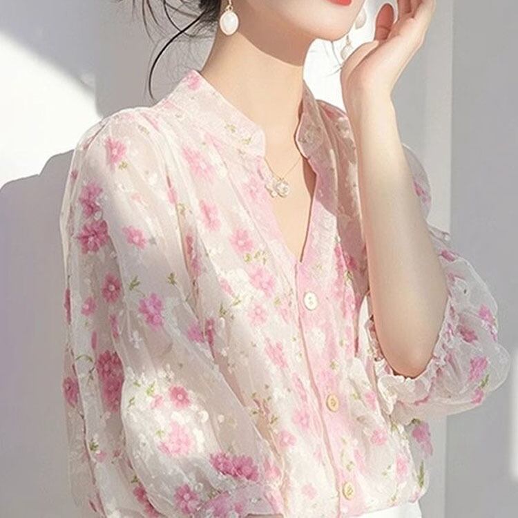 大人可愛い春色ピンクカラーの花柄ブラウス。